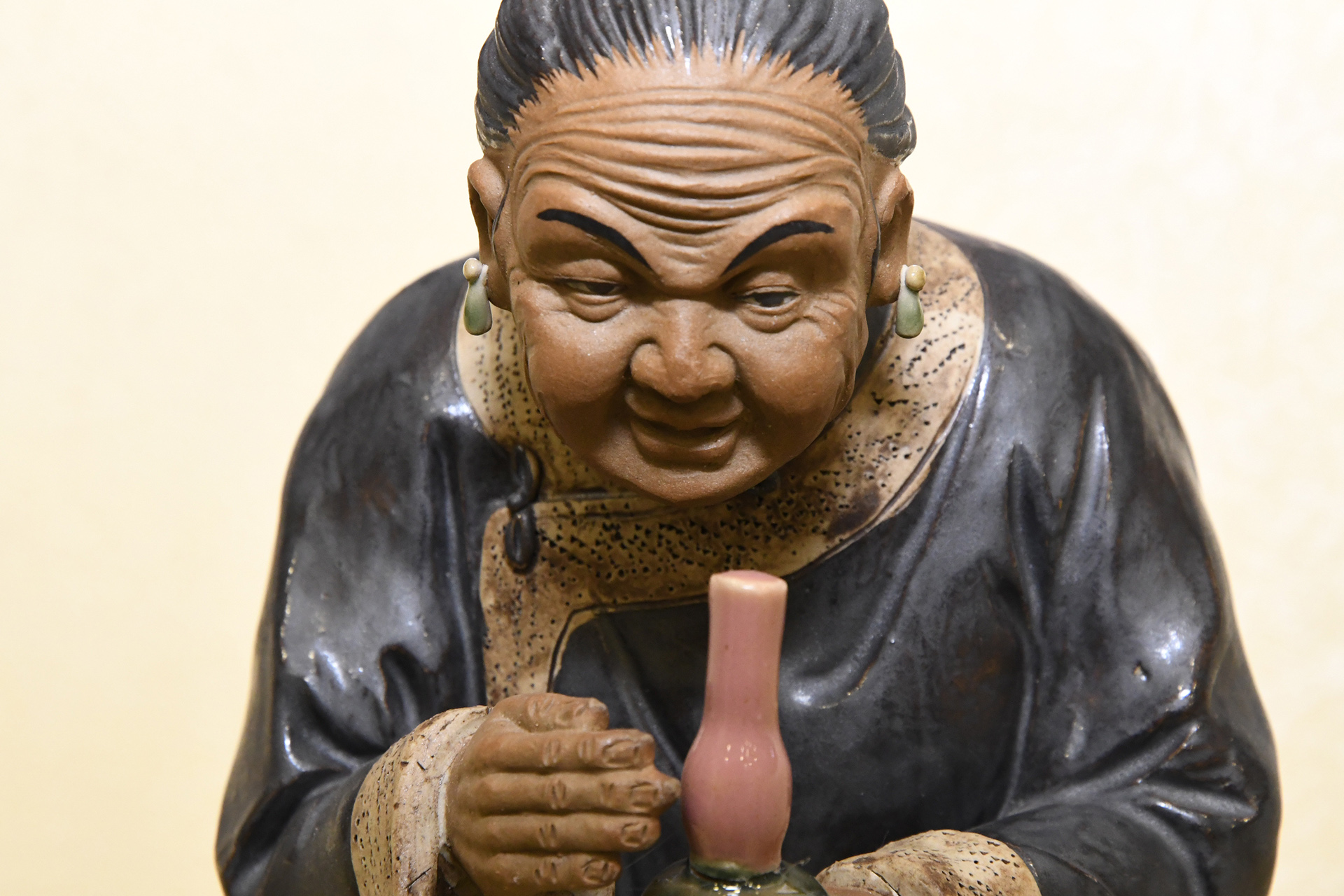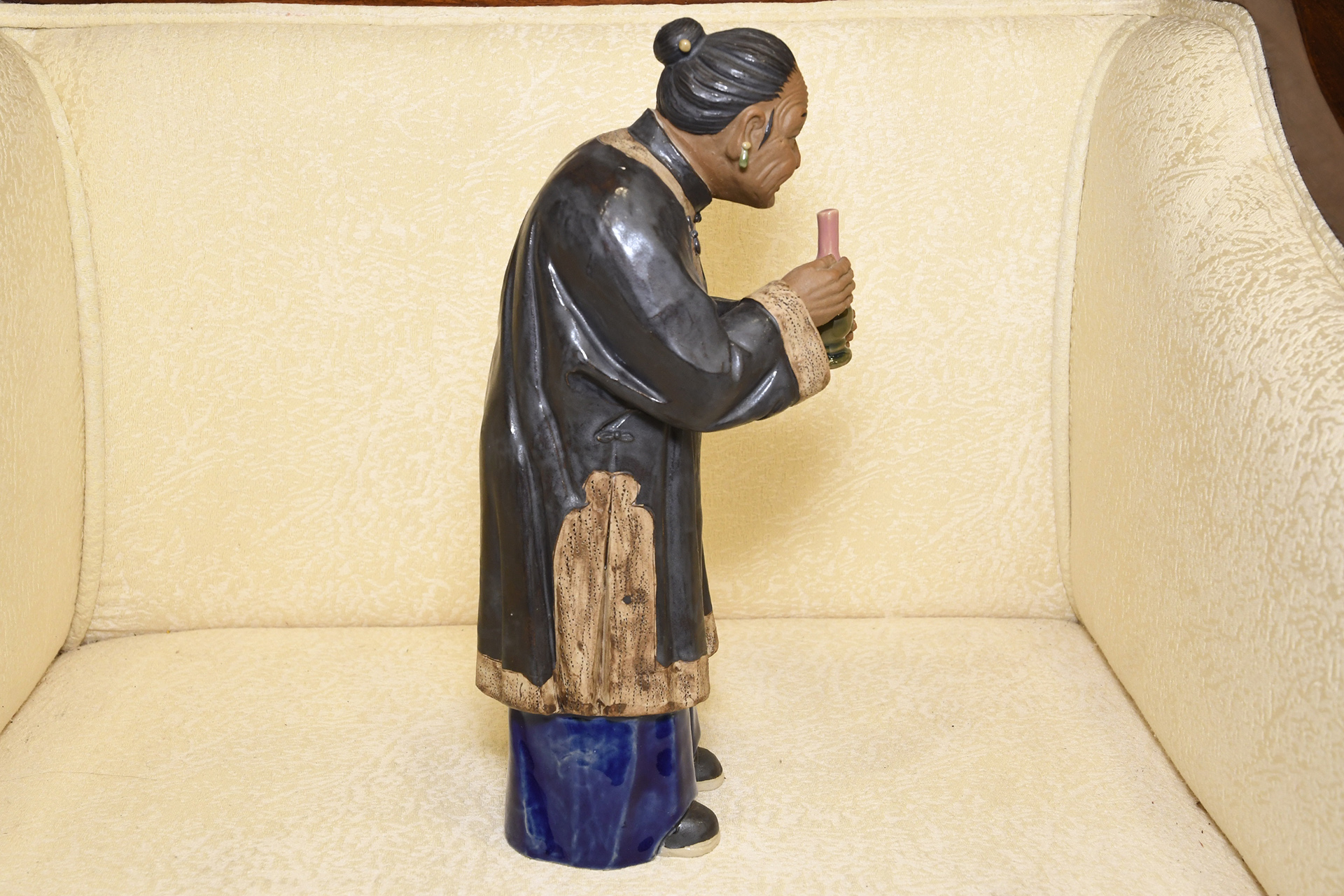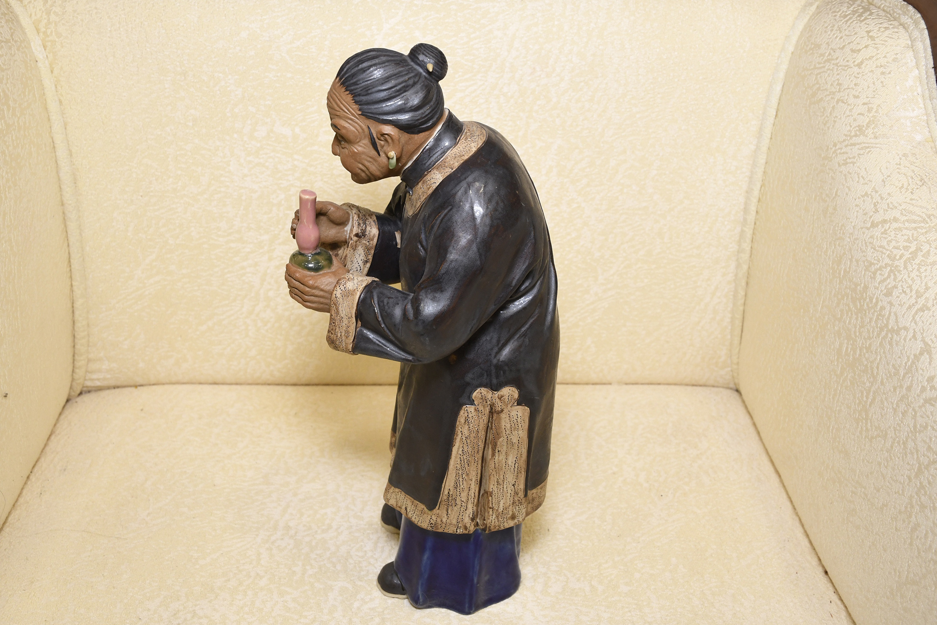 This piece of porcelain Shiwan art has been made and finished completely by hand. The old lady has been hand painted and glazed with some lovely detailing.