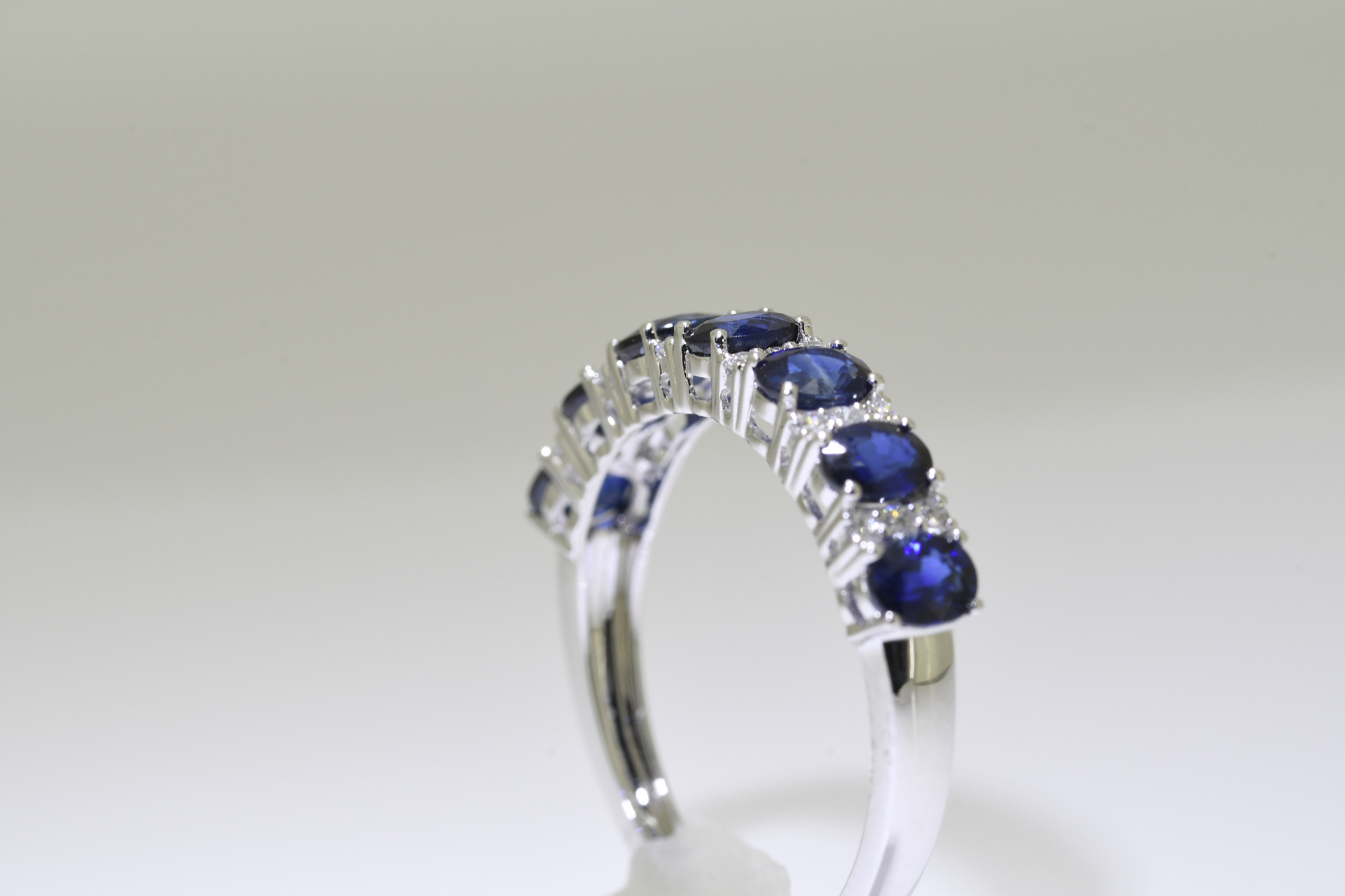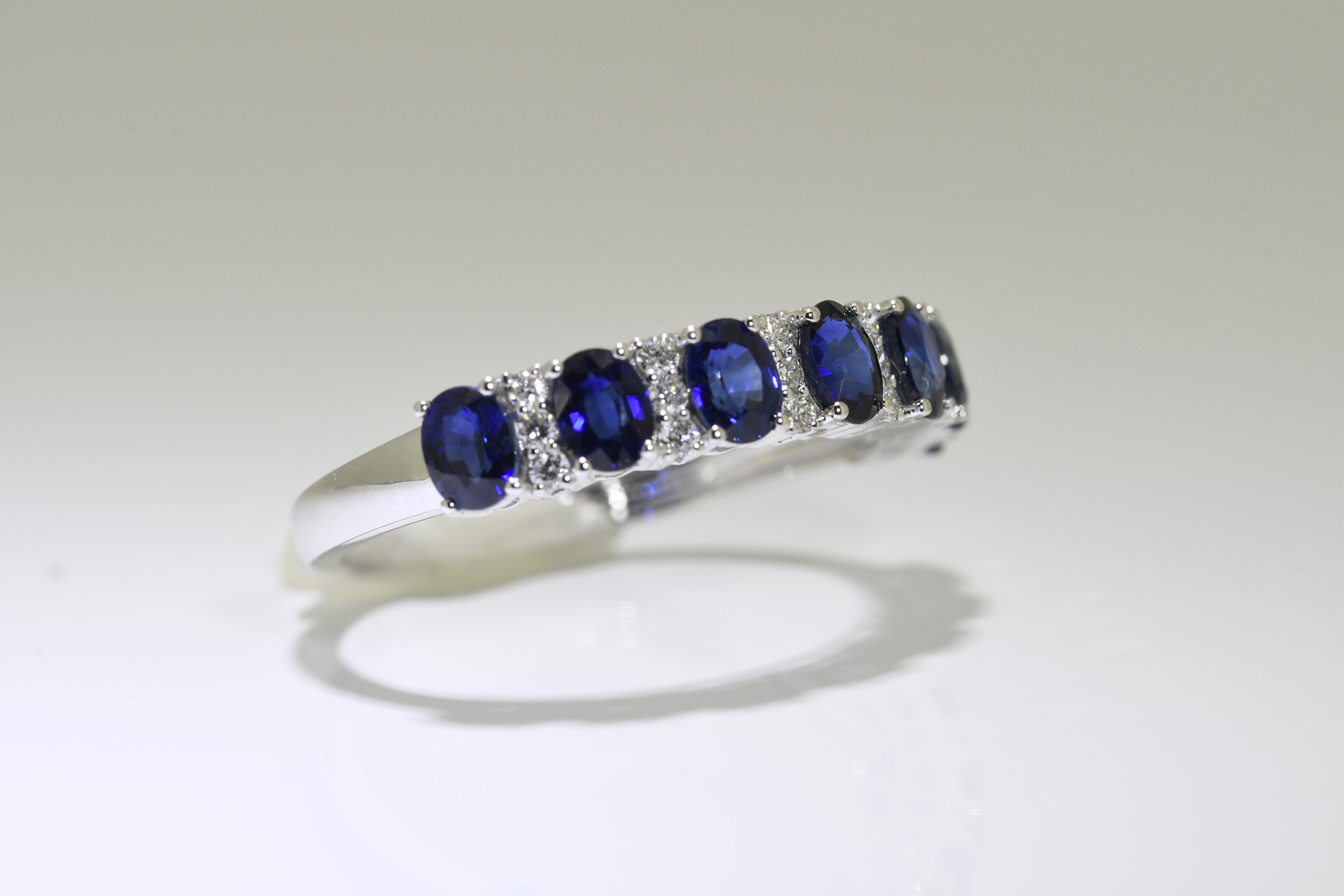 Seven stone Blue Sapphire & diamond ring set in 18 carat white gold. Blue sapphire carat weight: 1.73 carat. Diamond carat weight: 0.16 carat. Ring size "O" *All Rings can be re-sized for a nominal fee of £30 (see buyers guide)