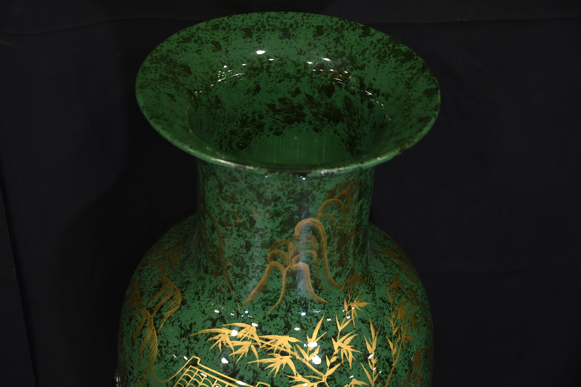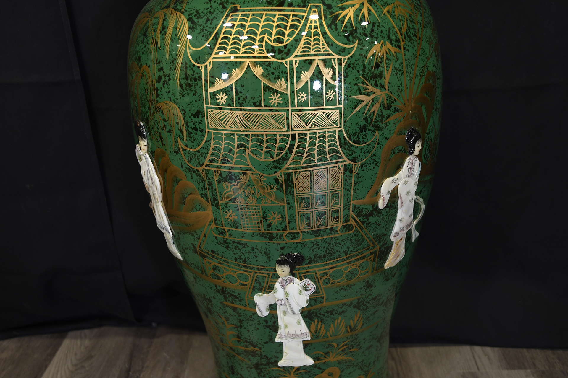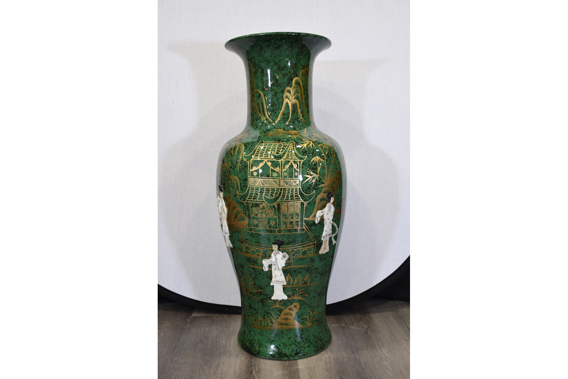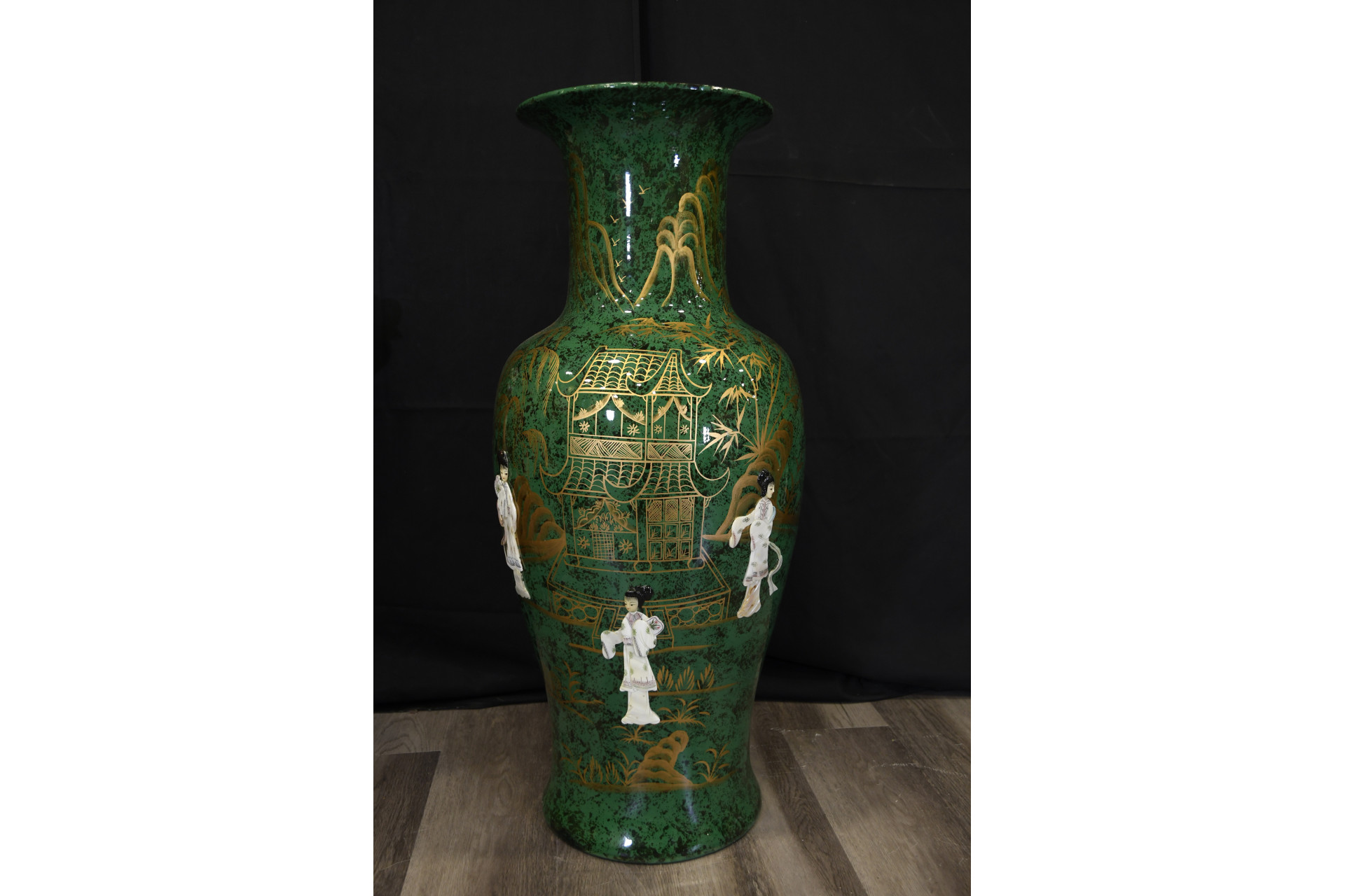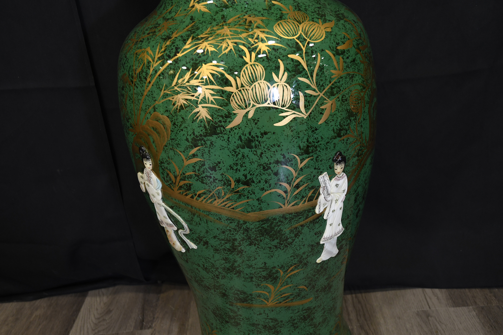 Large 36 inch porcelain fish tail vase, hand painted in green and gold and finished with geisha Origin Province Unknown Circa 1990. Condition Good.