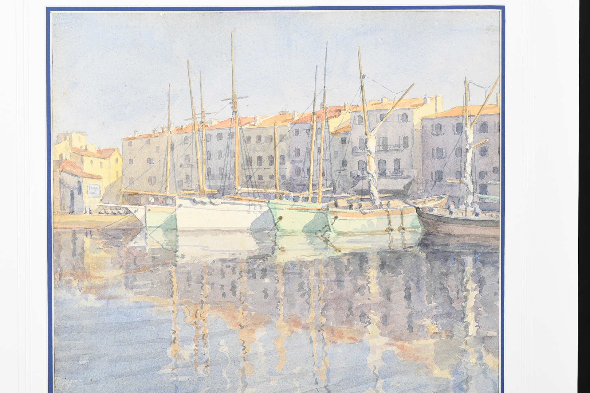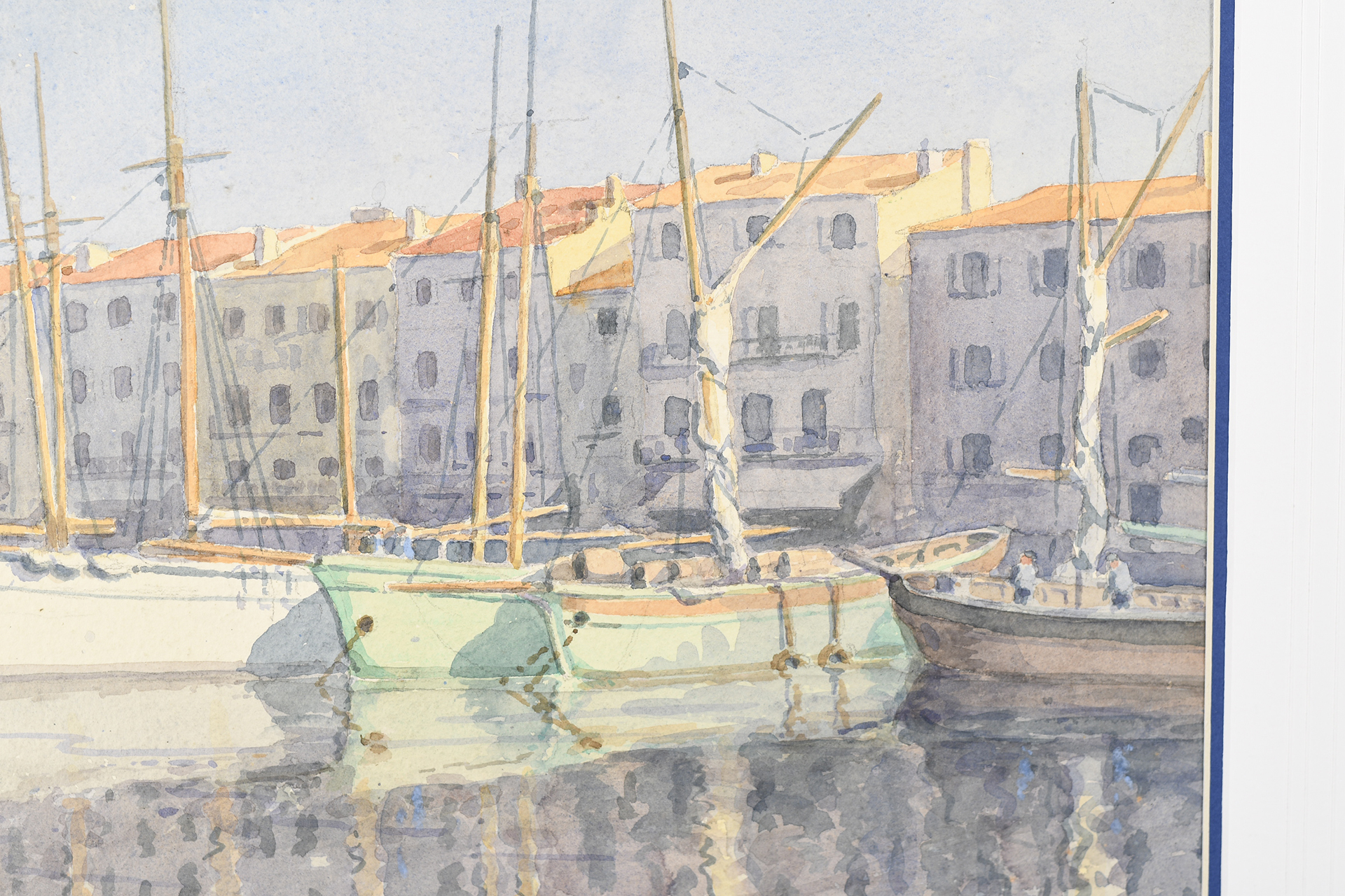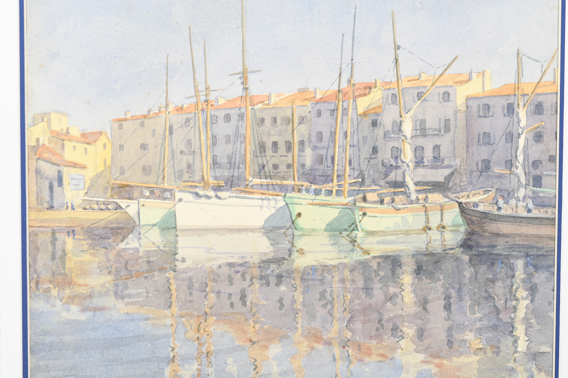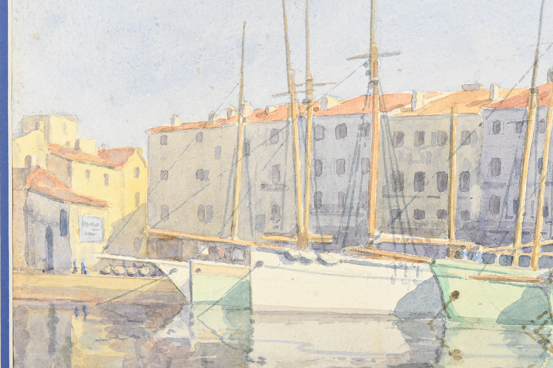 Original watercolour by A.C. Winter dated 1933. Colourful Mediterranean scene with yachts in a bay.