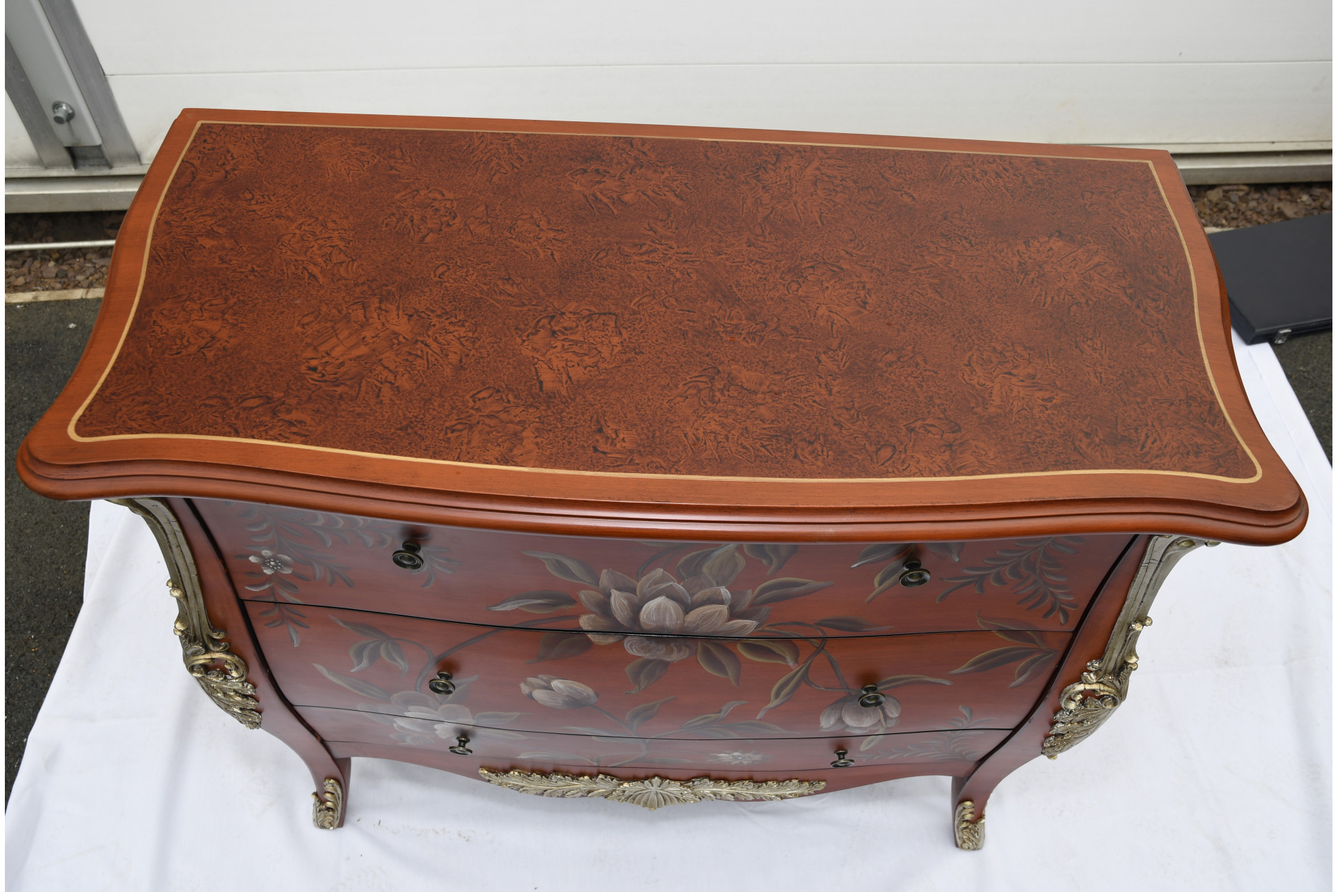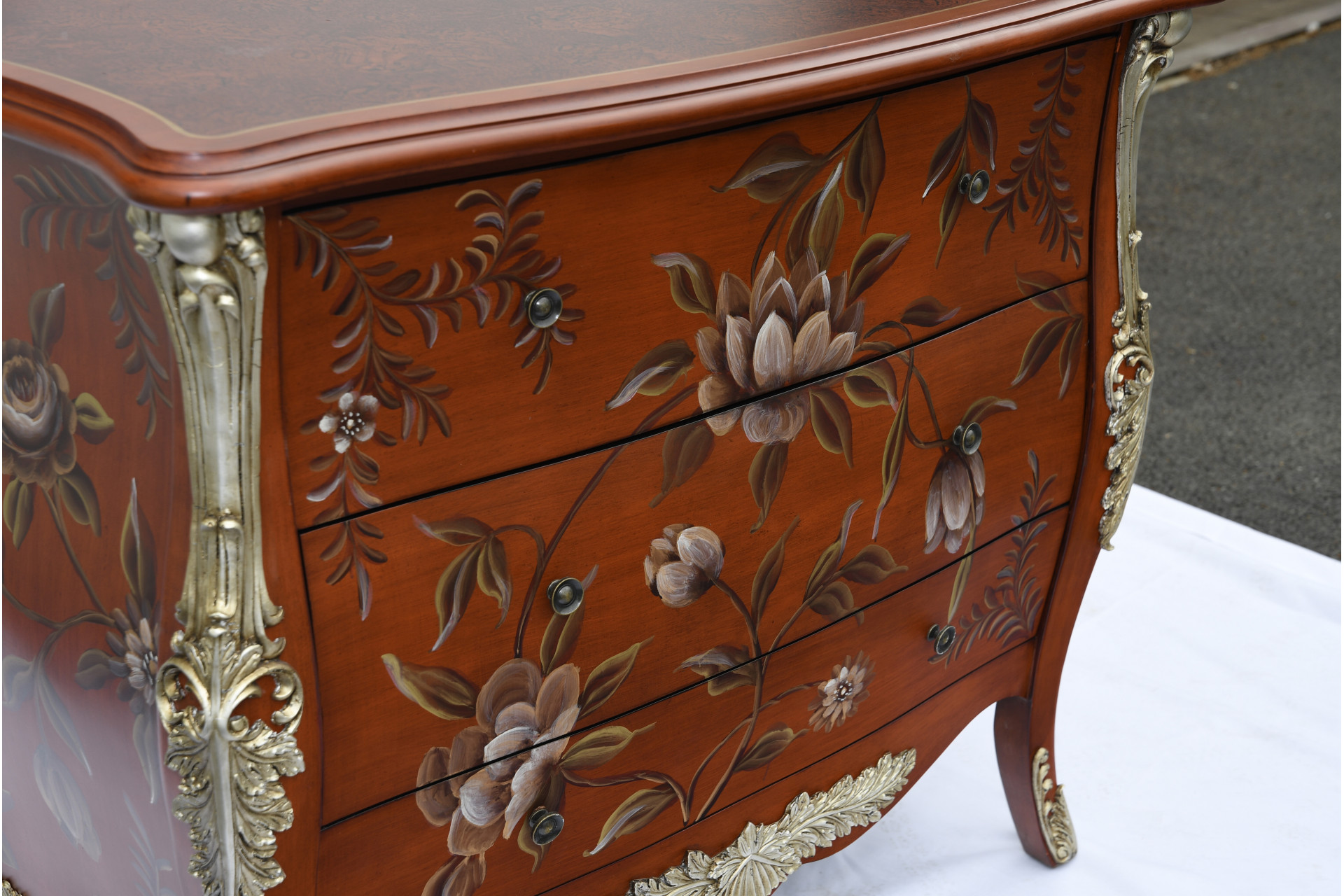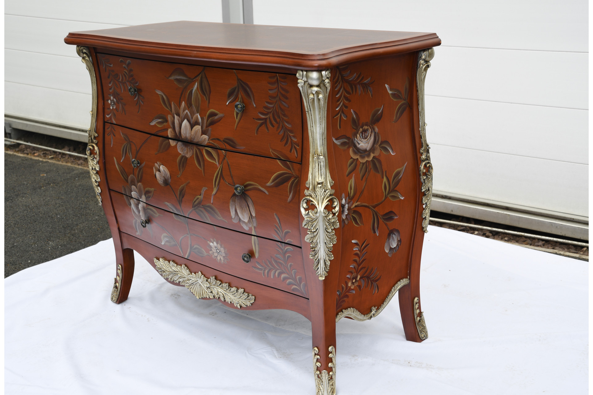 This stunning 3 drawer lacquered chest has been totally hand painted with a floral design. Gold accents painted into the detailing on the side and feet of the cabinet. The top has a marble effect which again has been done by hand. A really lovely accent piece of hand made furniture. Ex display piece but in superb condition.