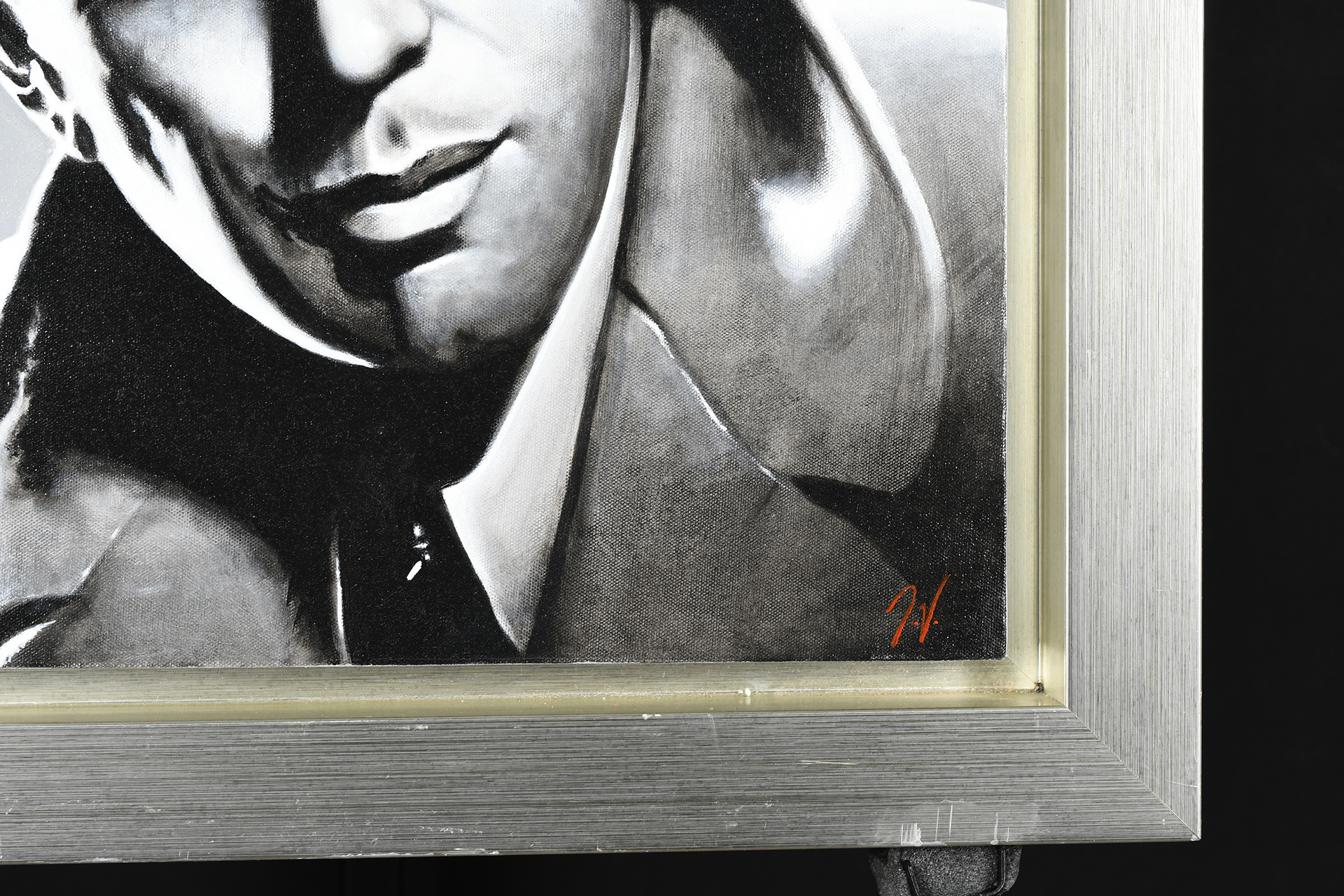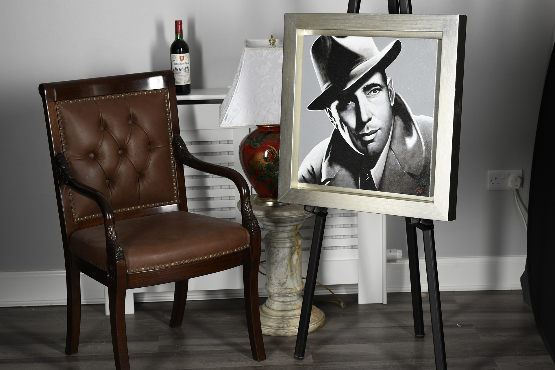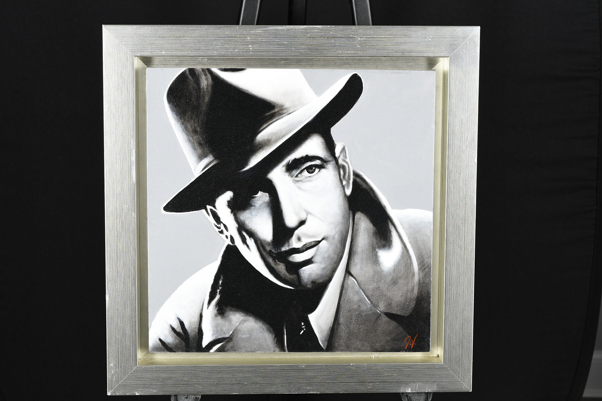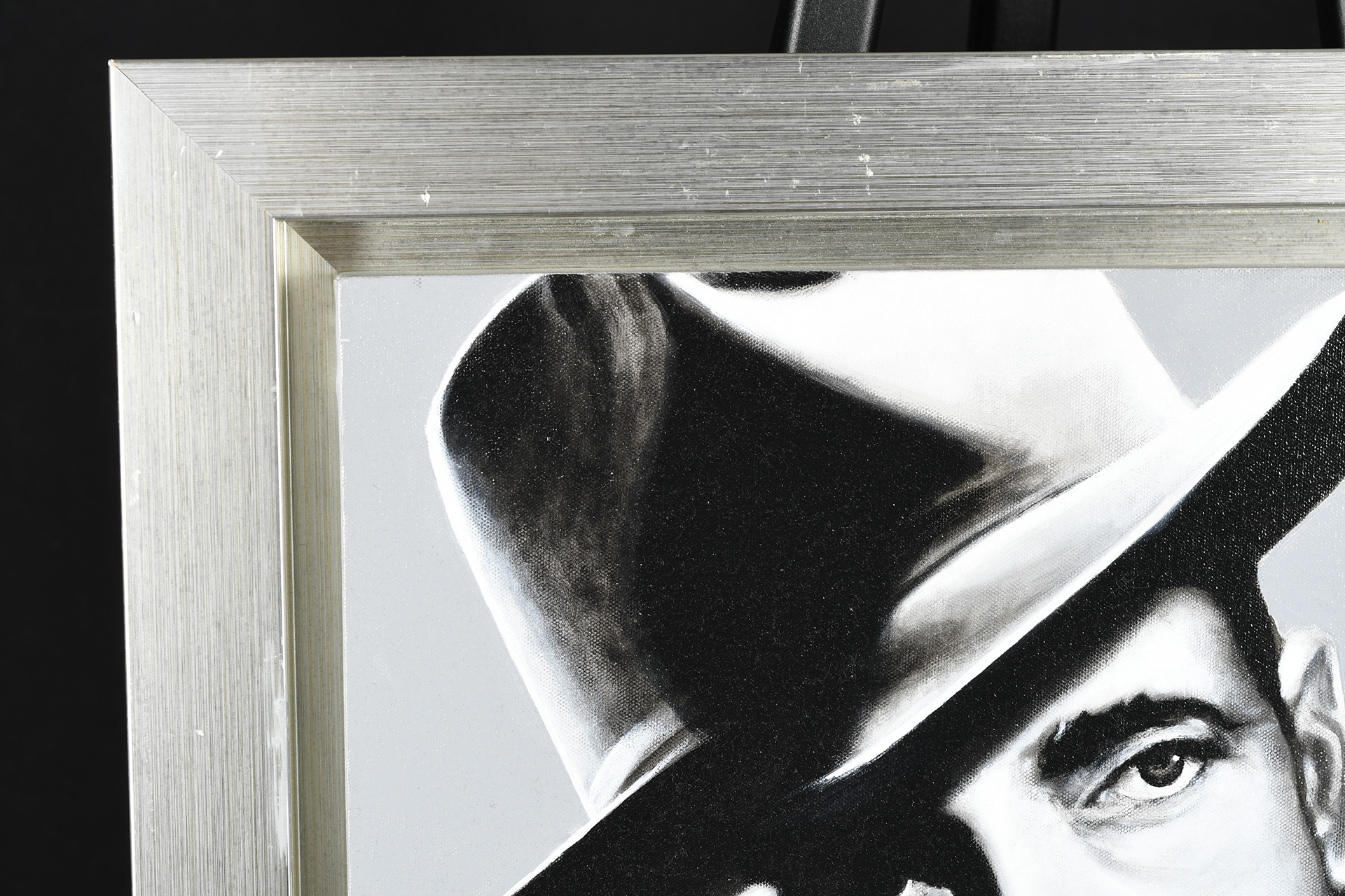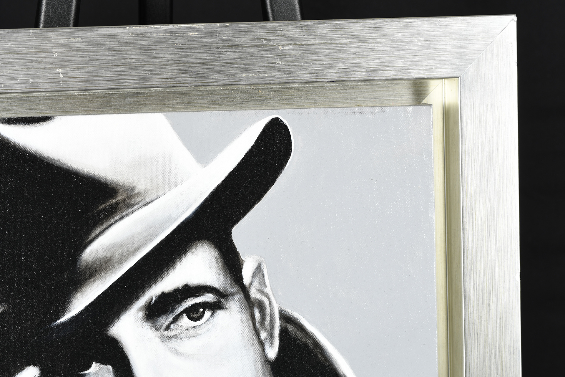 Original oil on canvas of Humphrey Bogart in bespoke frame. The painting is signed T V by the English artist Terence Vickress. A very fine and superbly executed original painting by this talented artist. The frame has a few little marks. It will be supplied with biographical details on the artist and a replacement valuation for £950 free of charge.
