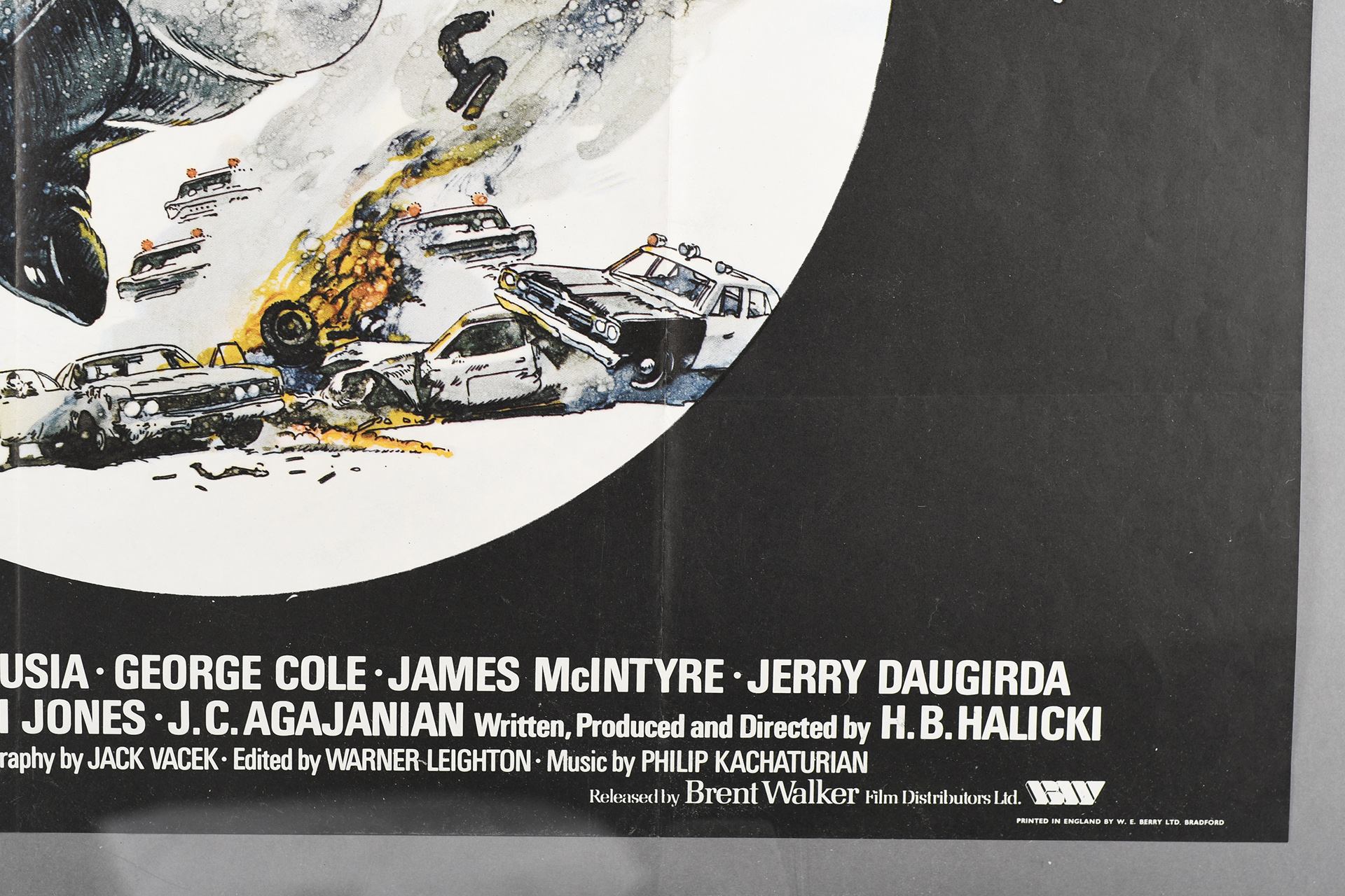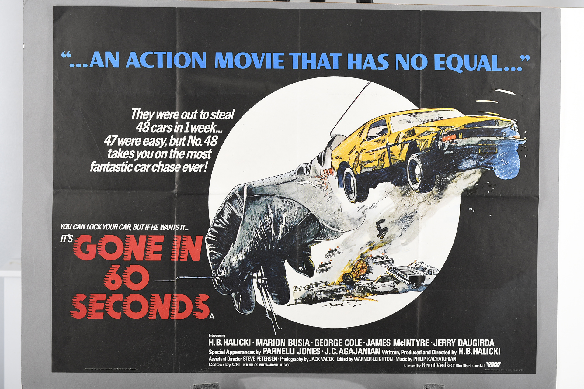 Original cinema poster for the 1974 film "Gone in 60 Seconds". Printed in England by W.E. Berry Ltd. Bradford. Condition good for its age, little noticeable wear. Folded.