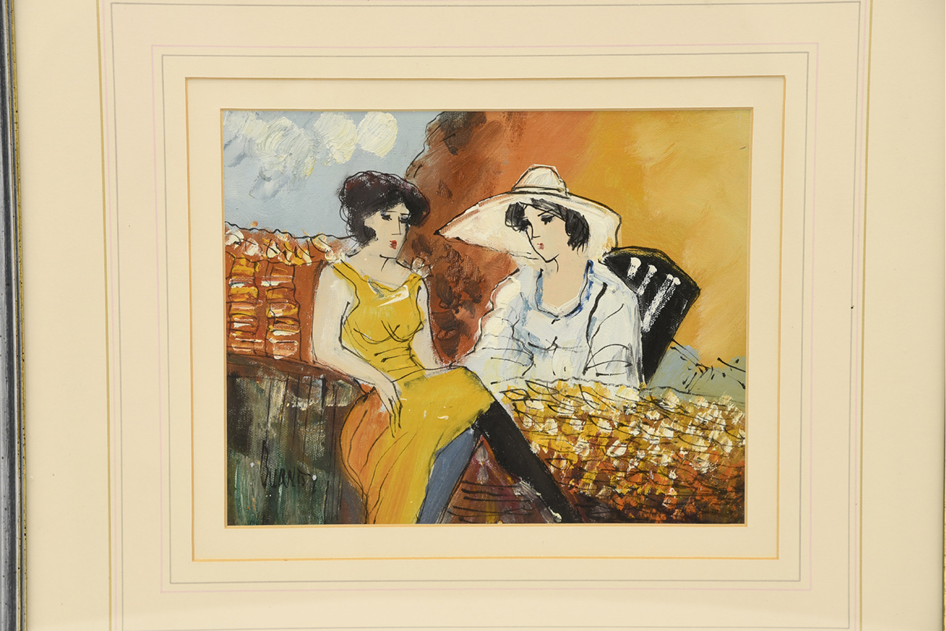 Framed oil on canvas of two ladies sitting.