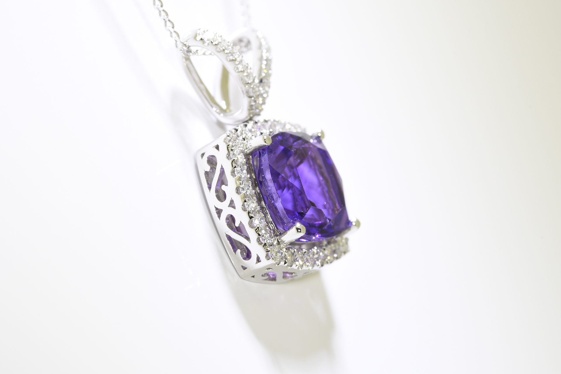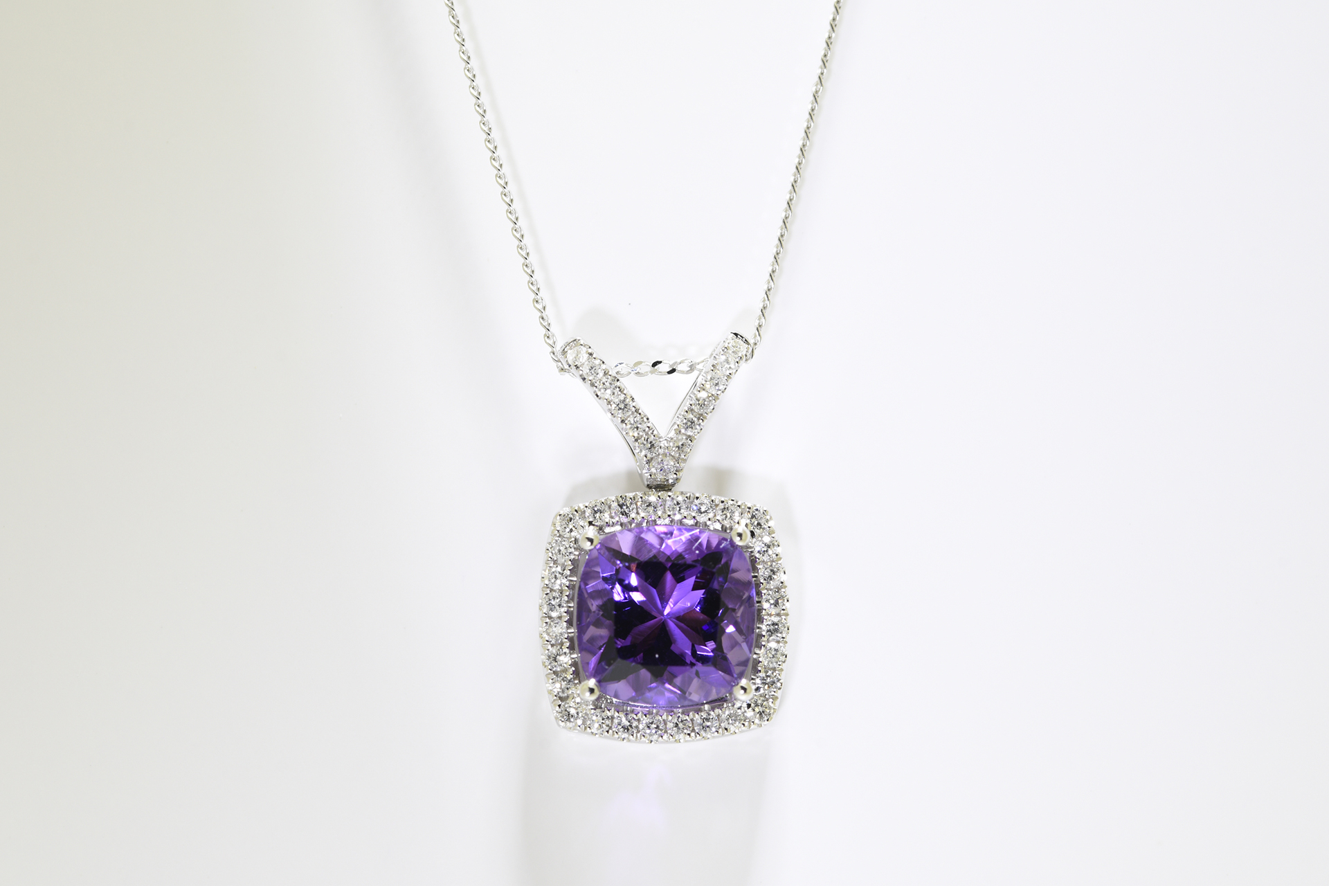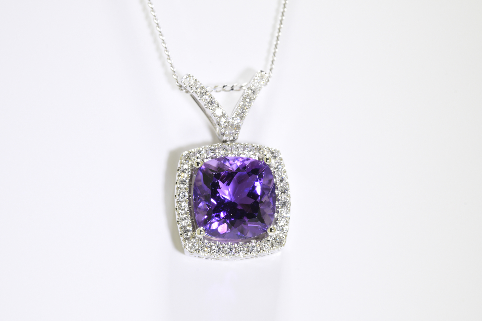 Cushion cut Amethyst & Diamond Pendant set in 18 carat white gold with 18 inch 18ct gold chain. Amethyst carat weight: 2.26 carat. Diamond carat weight: 0.24 carat.