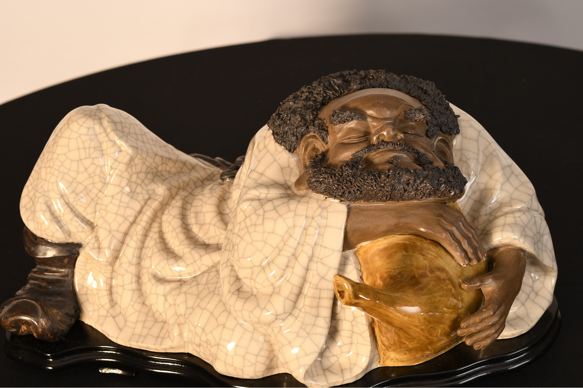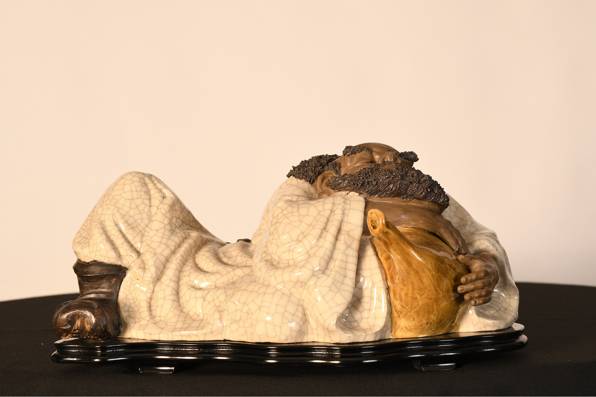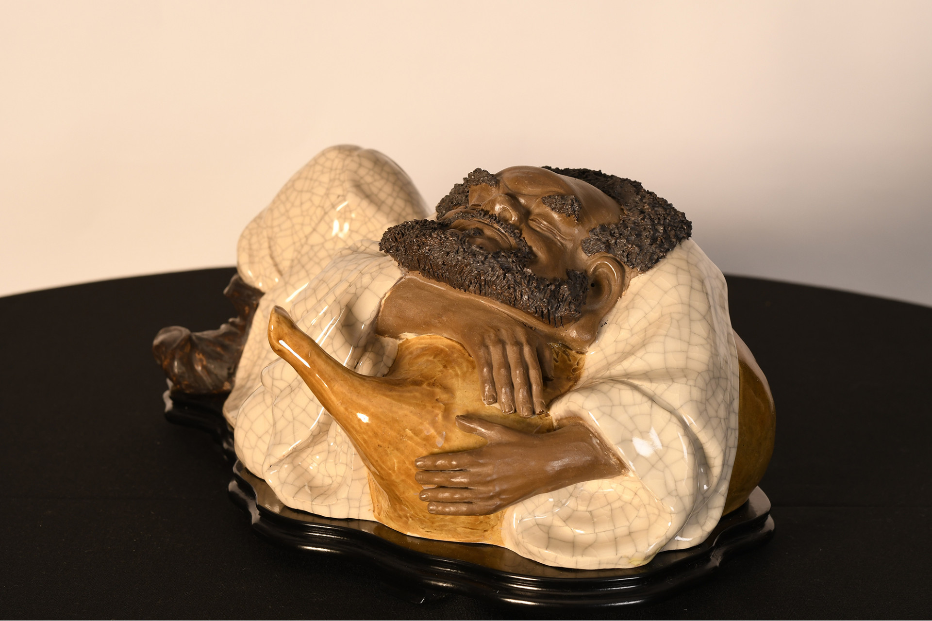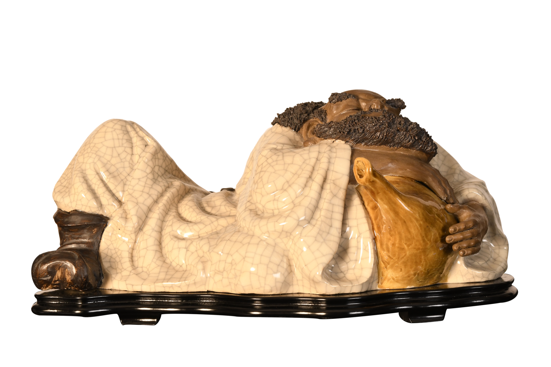 A Shiwan original figure depicting a drunk man, made in porcelain crackle and glazed, extremely fine porcelain beard simulation overlays, it comes with a specially formed wooden plinth Origin Foshan Guangdong Province circa 1990s. Condition good.