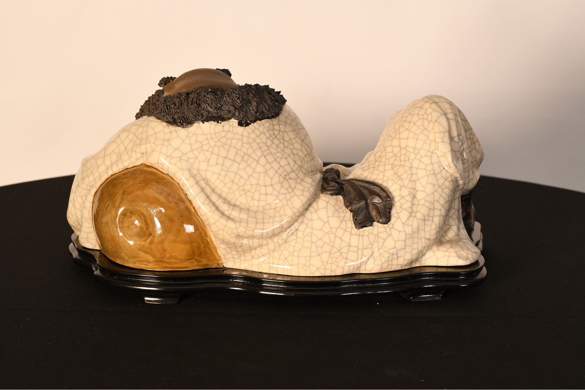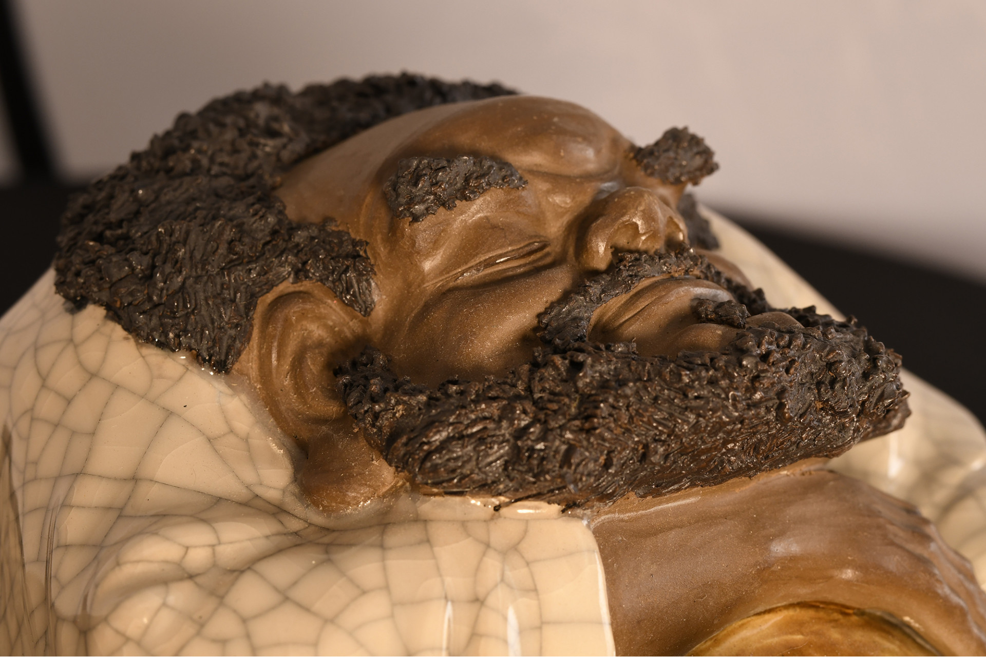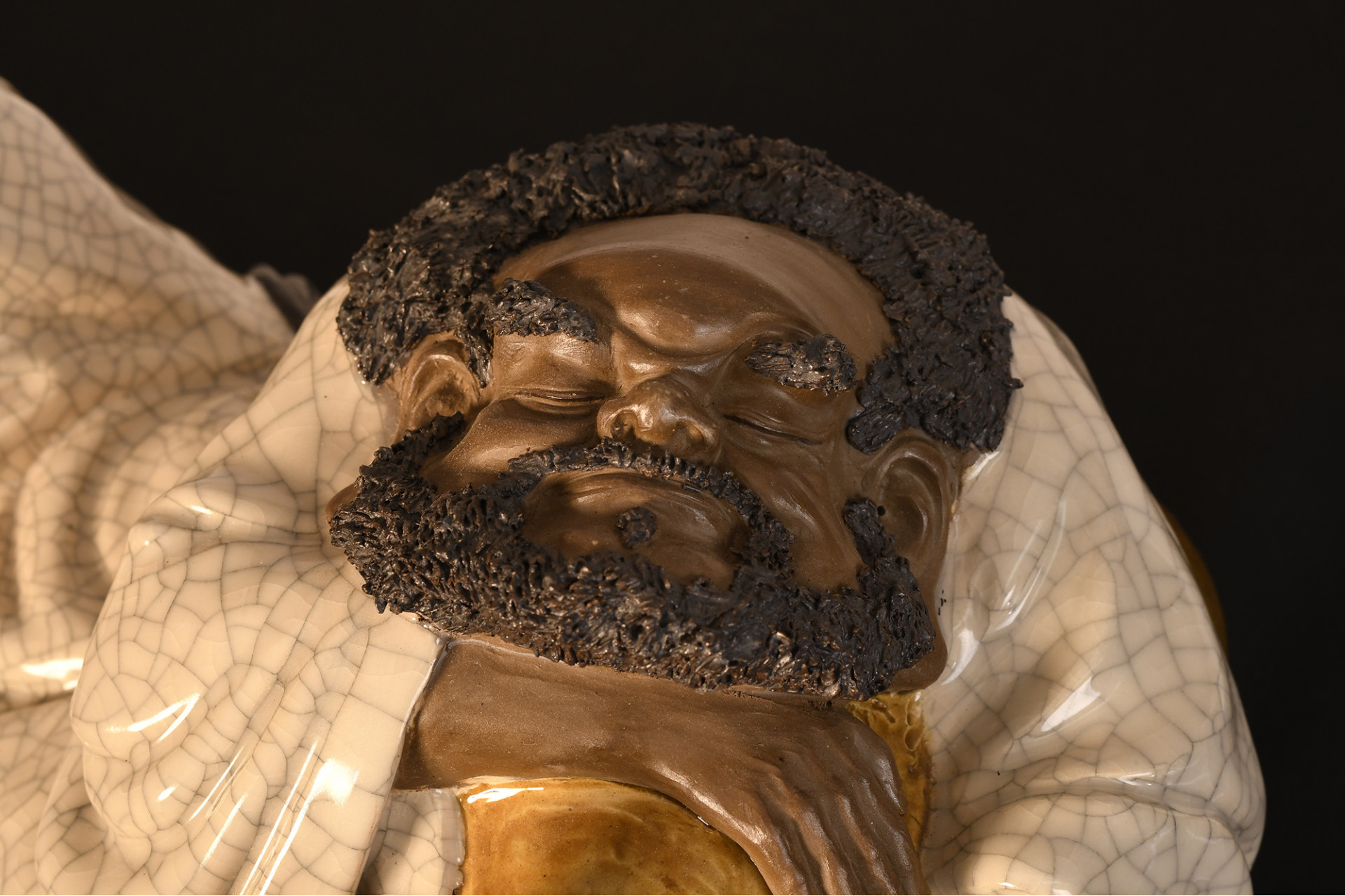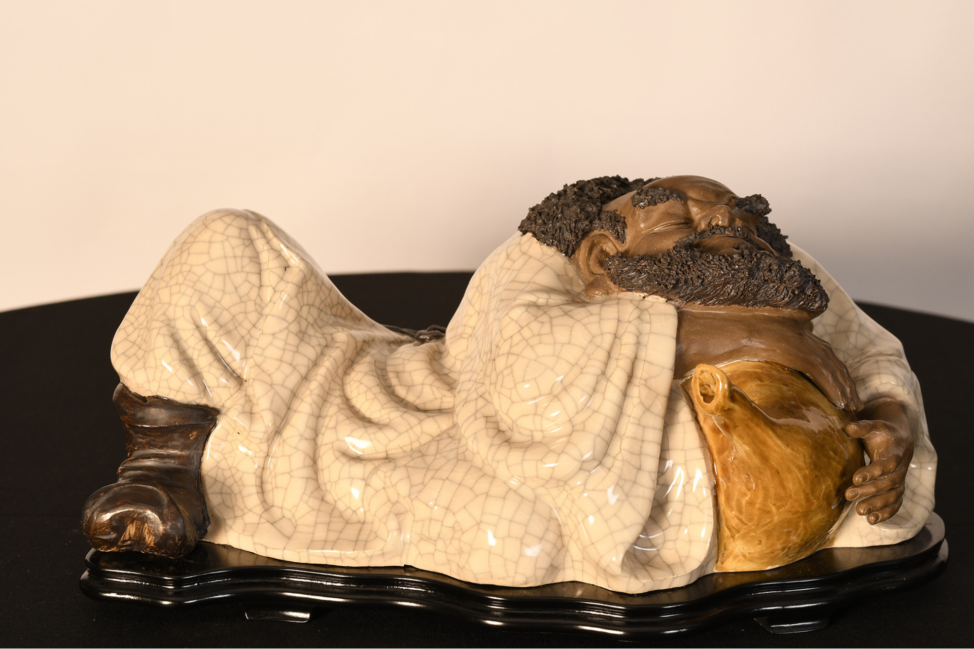 A Shiwan original figure depicting a drunk man, made in porcelain crackle and glazed, extremely fine porcelain beard simulation overlays, it comes with a specially formed wooden plinth Origin Foshan Guangdong Province circa 1990s. Condition good.