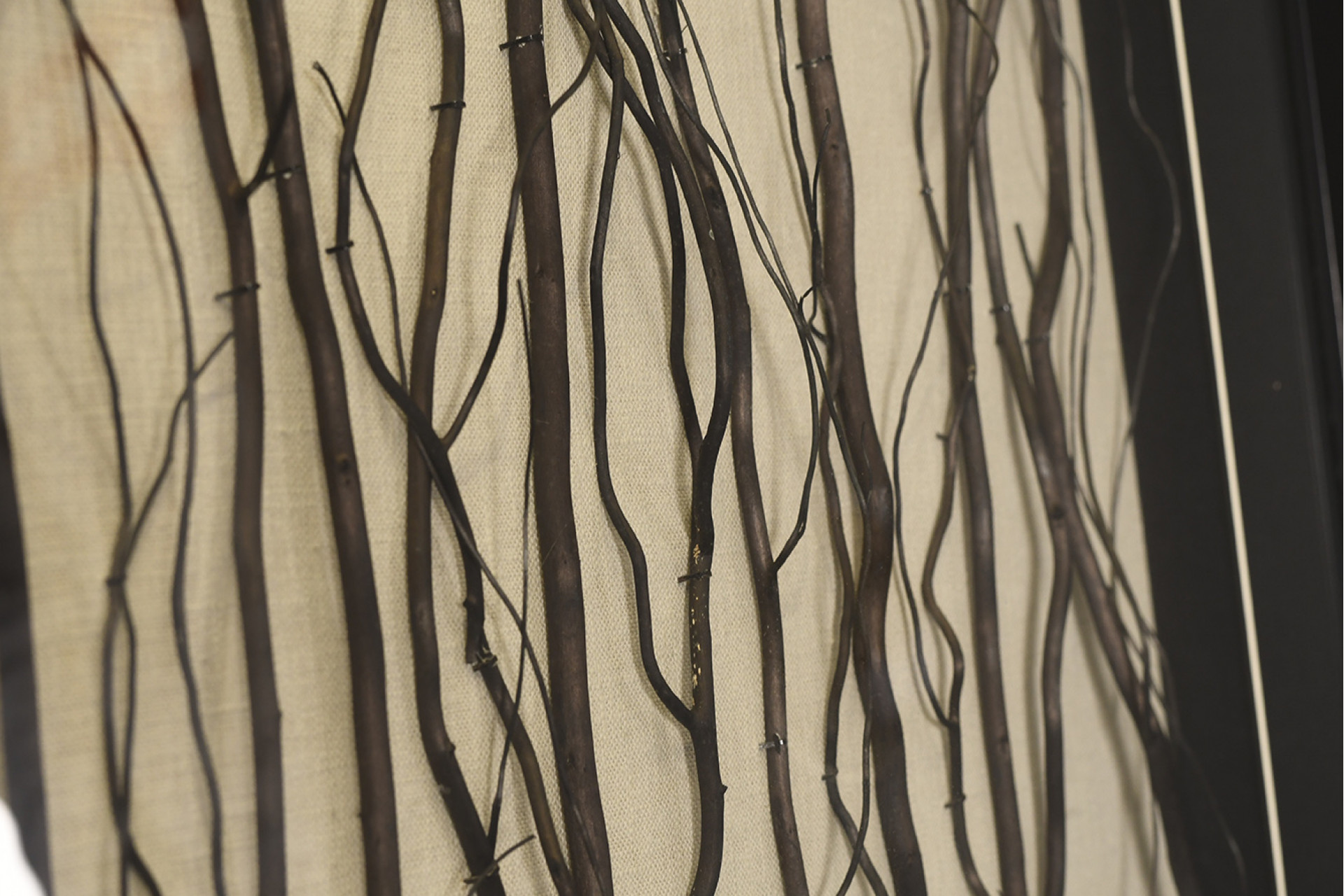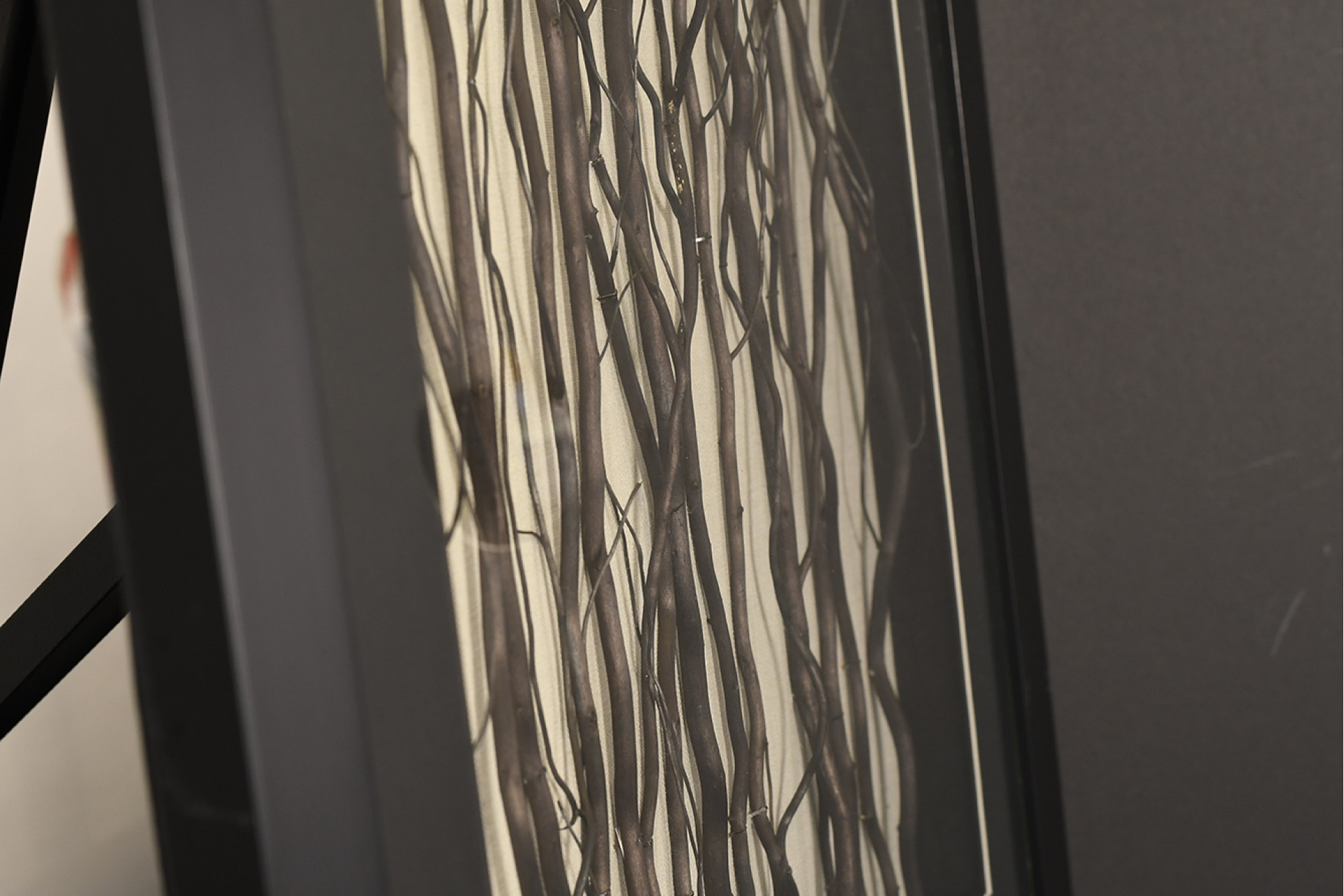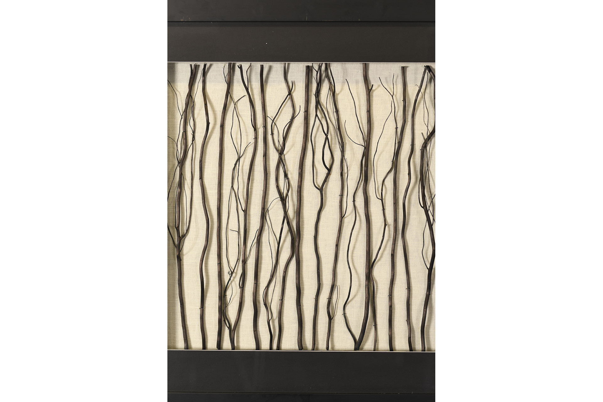 Modern framed art with unusual wooden twig design which has been set into the frame.