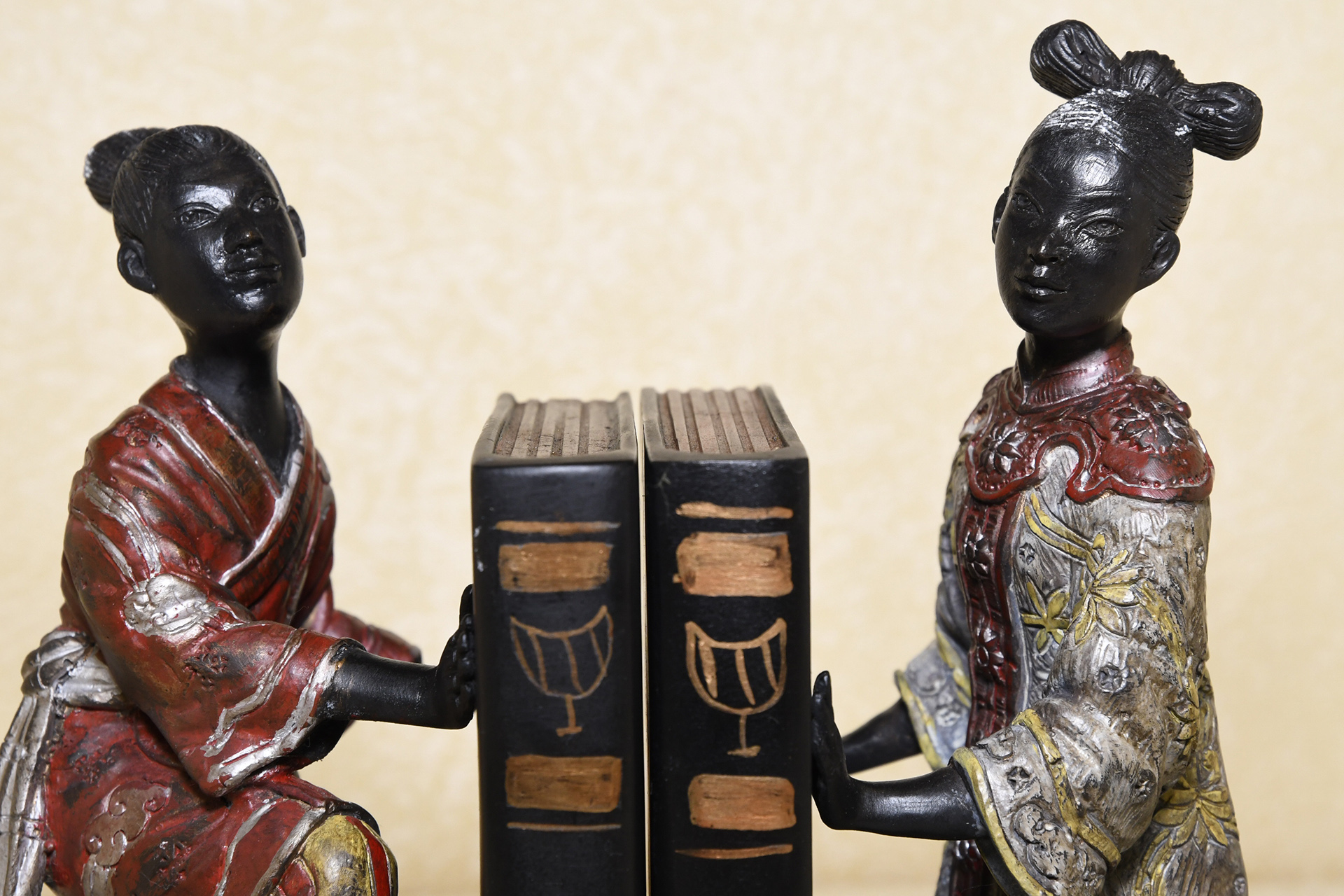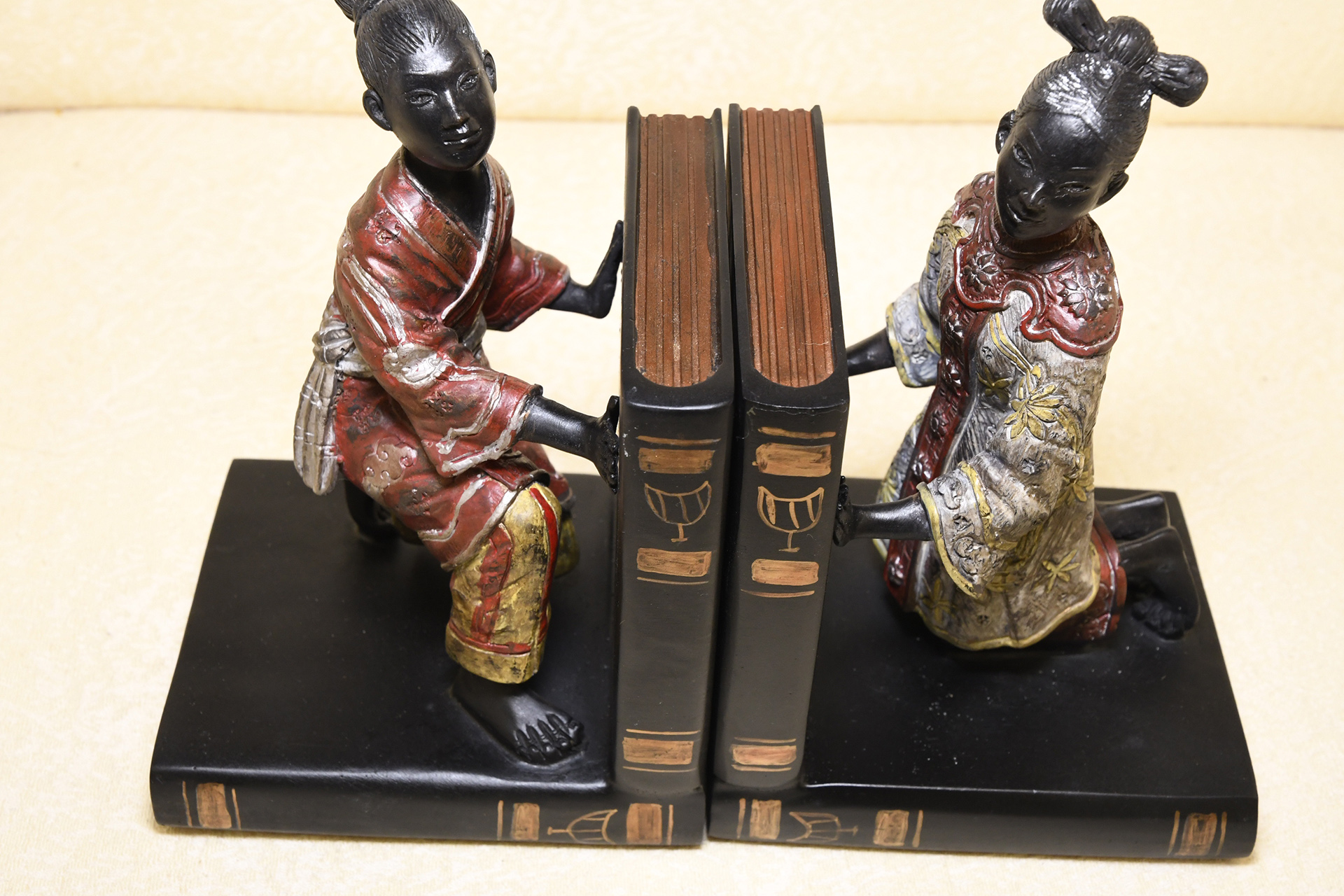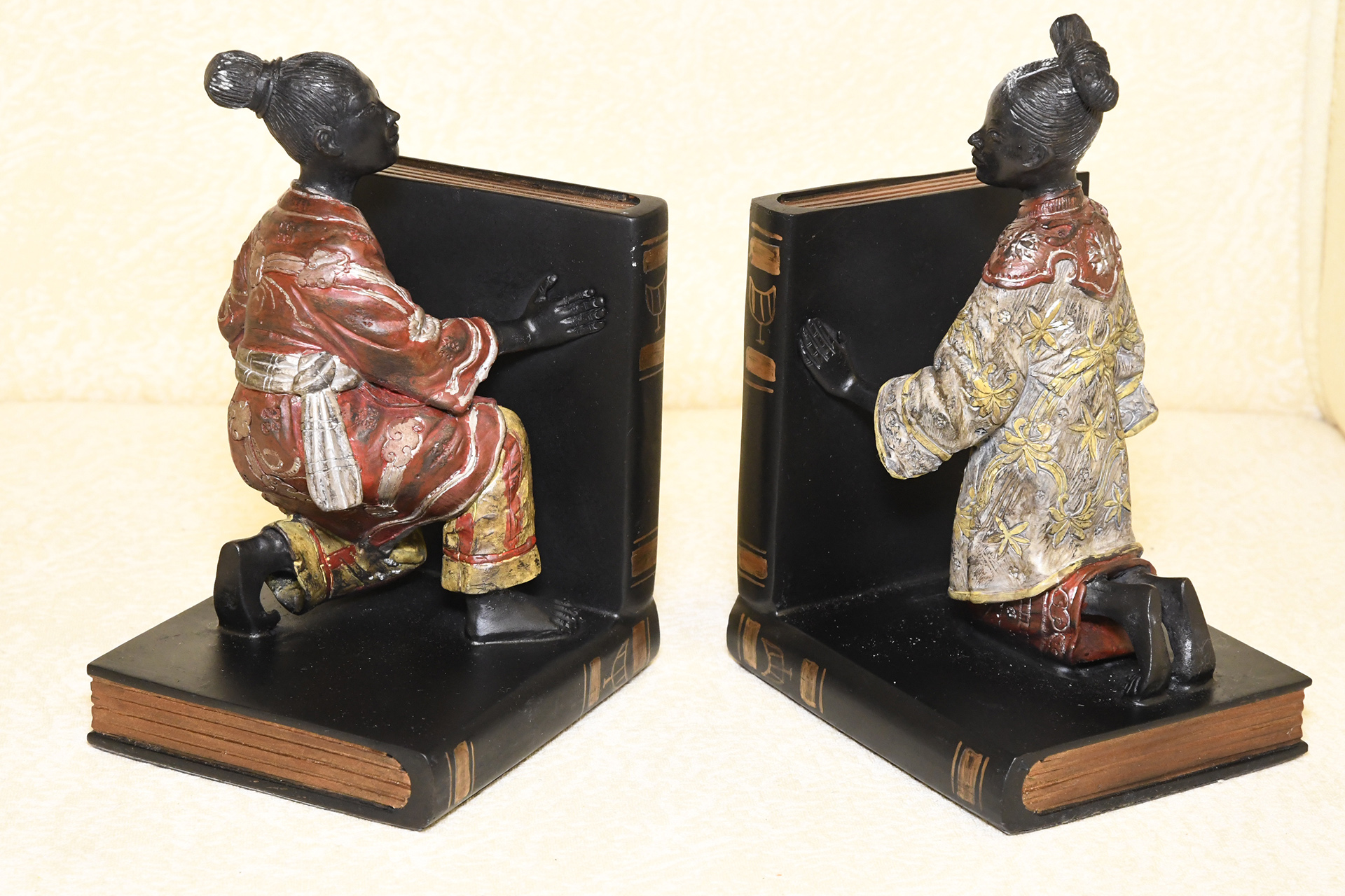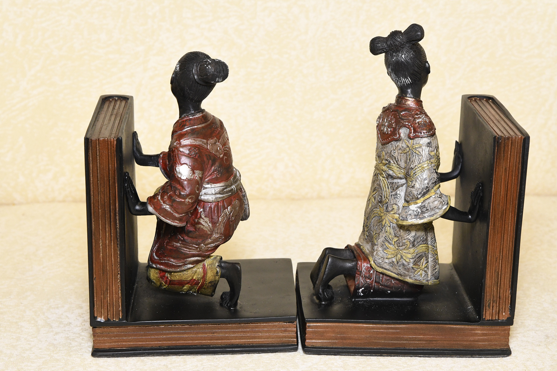 These bookends are made from solid hand cast brass with the painting and detailing all done by hand.