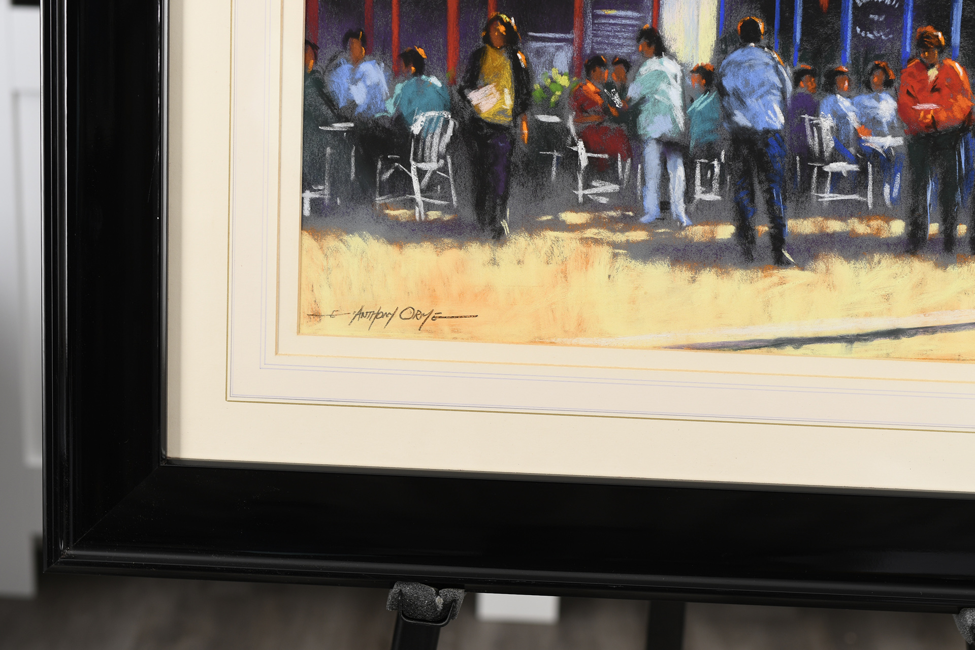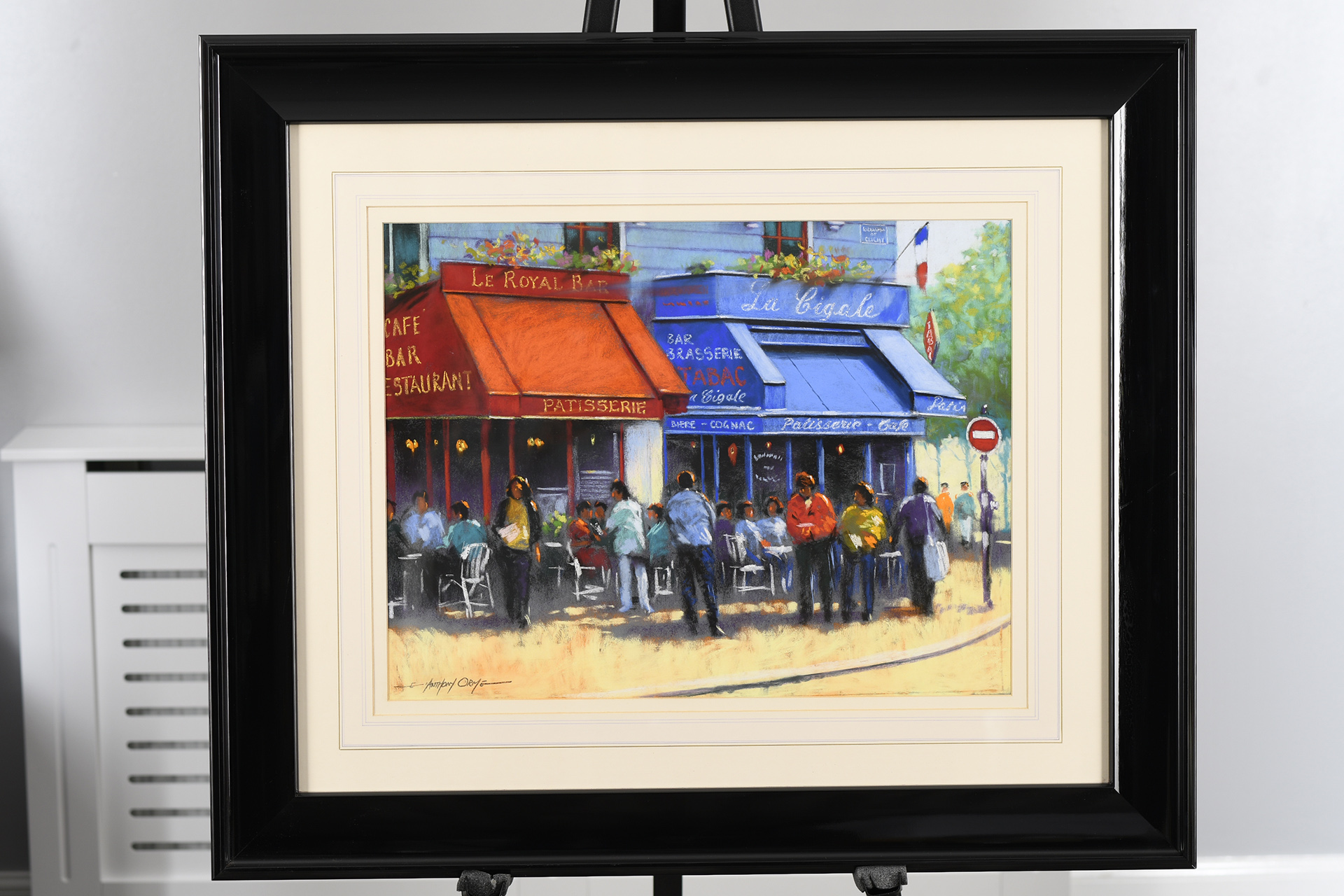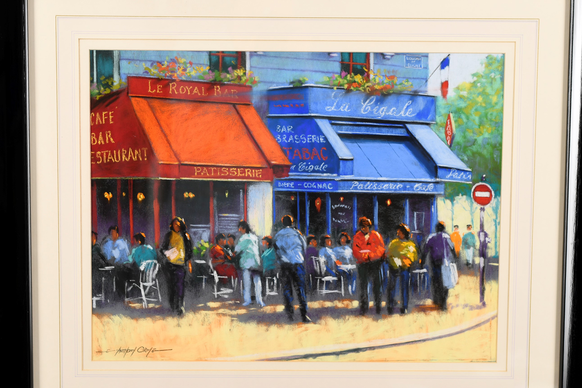 Framed original Pastel painting by the English artist Anthony Orme. A very colourful painting depicting a French cafe scene. It is titled "The French Patisserie". Very nicely framed with a hand coloured washline mount. It is supplied with a replacement valuation for £2200 along with biographical details on the artist.