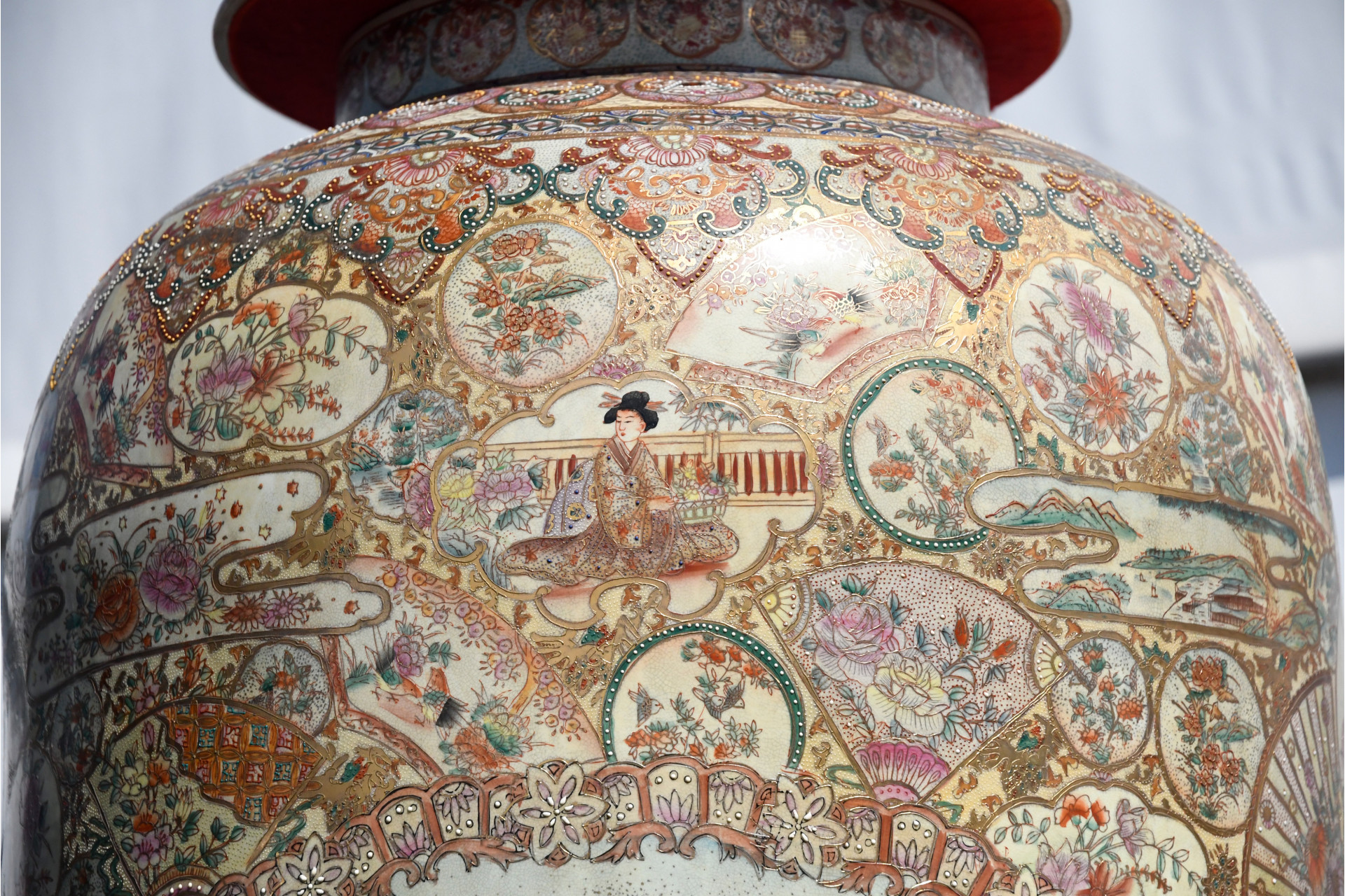 Rare 9 ft (2.8 metre) temple vase with separate base and lid made in porcelain and depicting various hand painted artistic scenes Origin Chaozhou Guangdong Province circa 1970s. Condition Good
