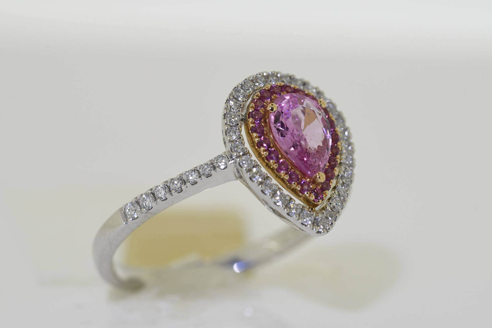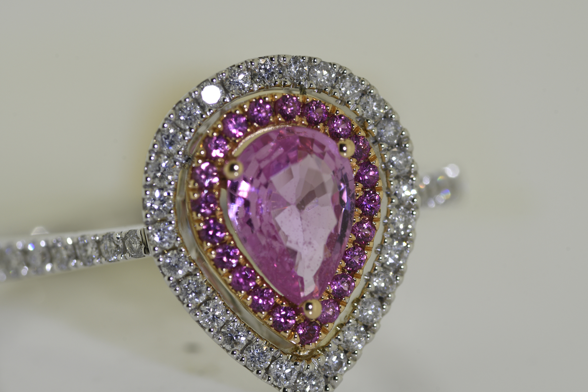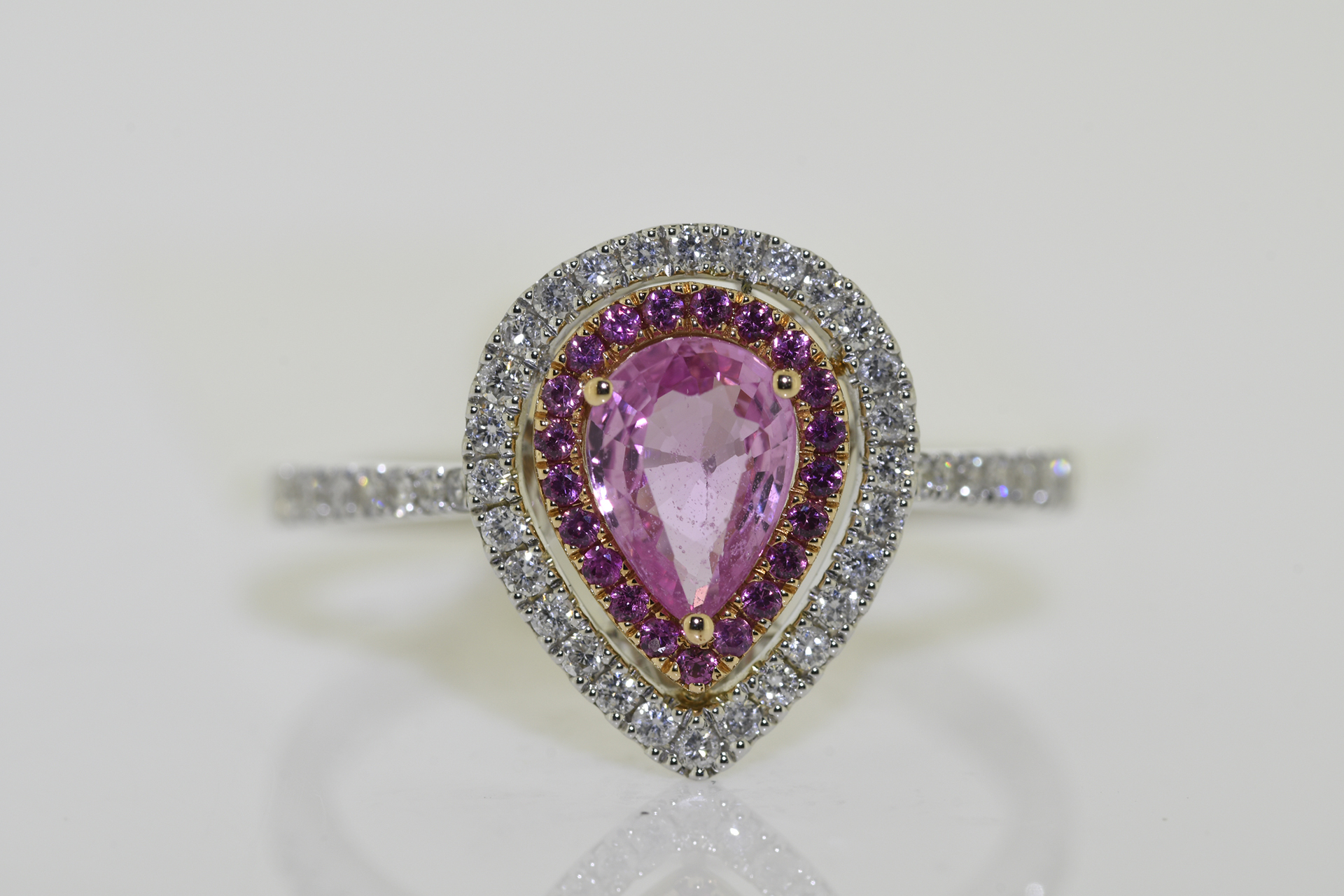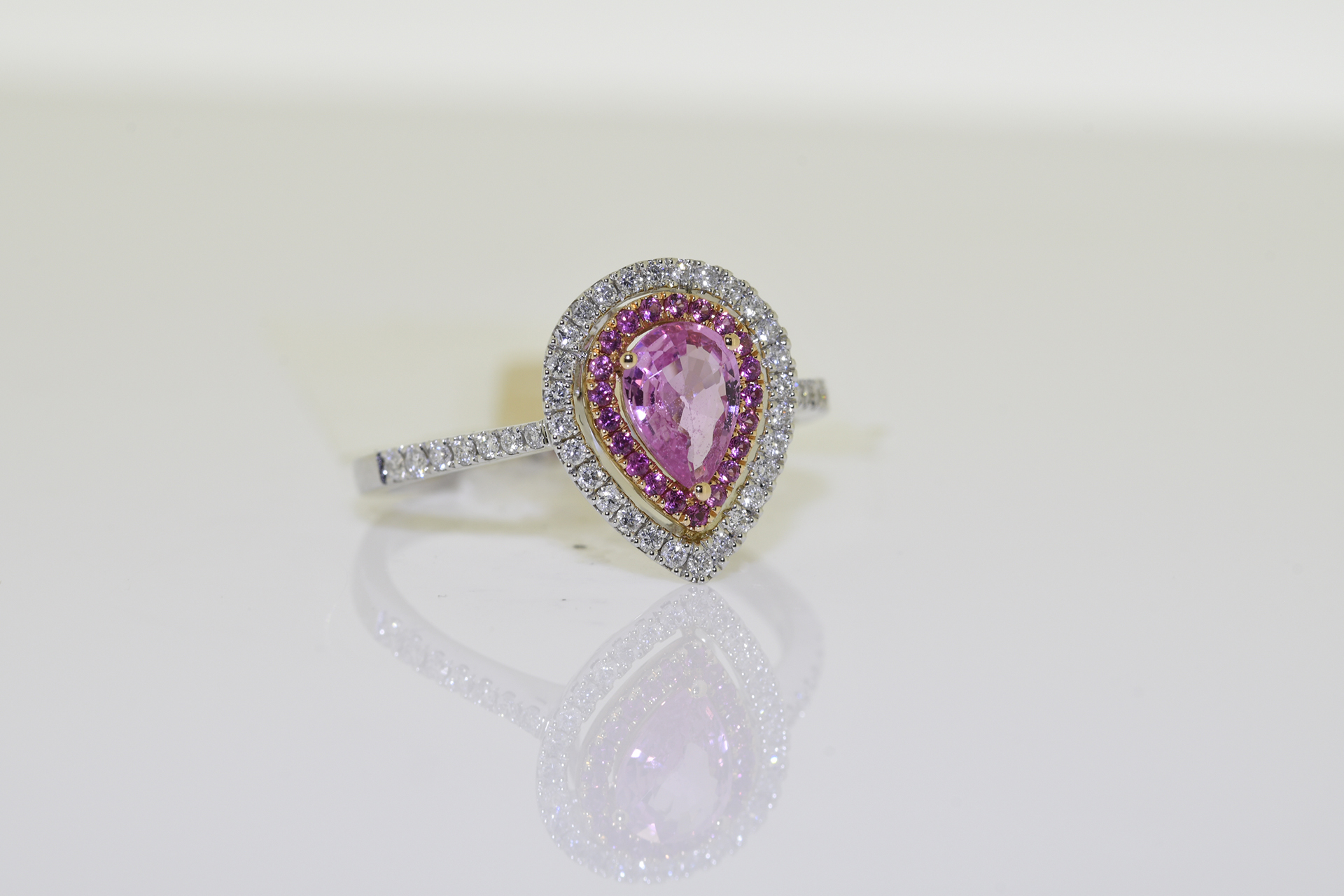18 carat ring in white gold with .75 carat pear shaped pink sapphire solitaire with diamond and sapphire halo cluster. Supplied with Insurance Valuation which includes diamond grading report for 1550 (free of charge) *All Rings can be re-sized for a nominal fee of 30 (see buyers guide) #1625