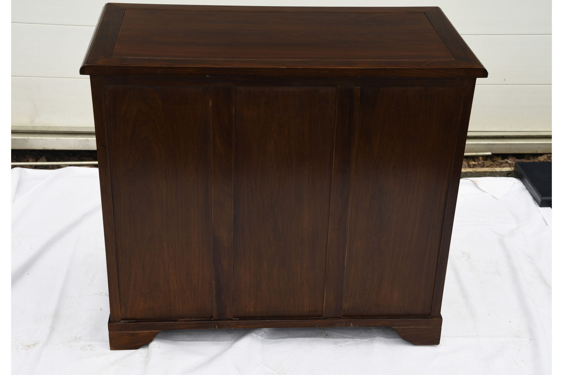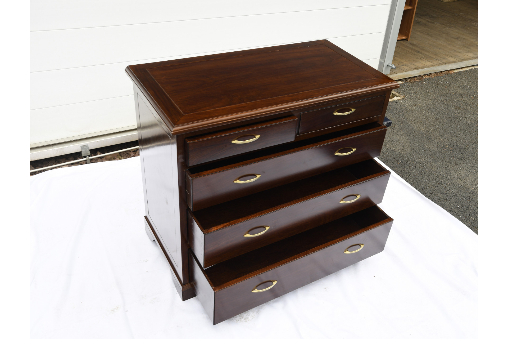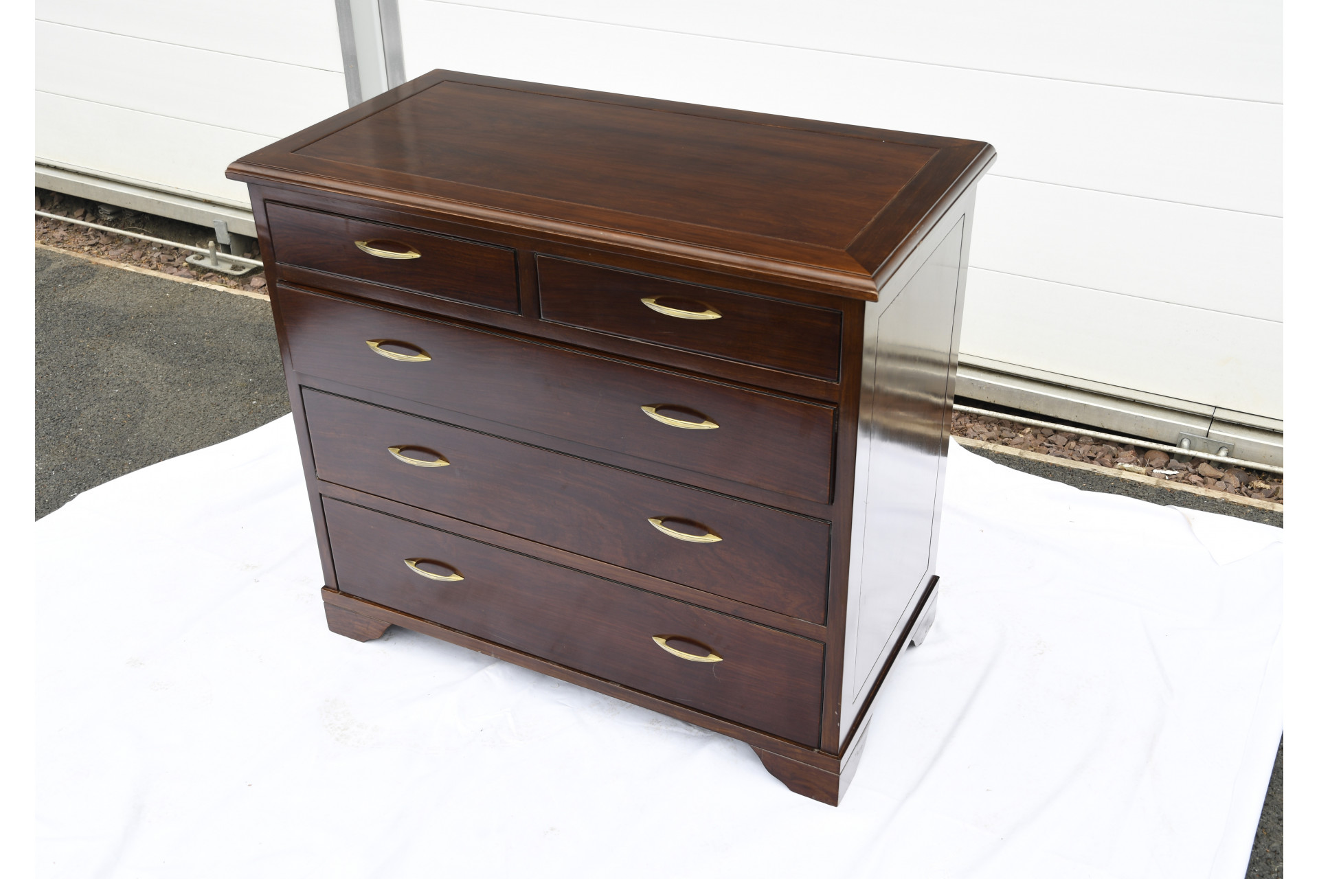 Very heavy solid hand made 5 drawers rosewood chest of drawers. All the drawers are dovetail jointed. The back of the unit is also panelled in solid rosewood. Beautifully polished to show the natural grain of the wood. A few little marks but structurally absolutely solid and in lovely condition for its age.