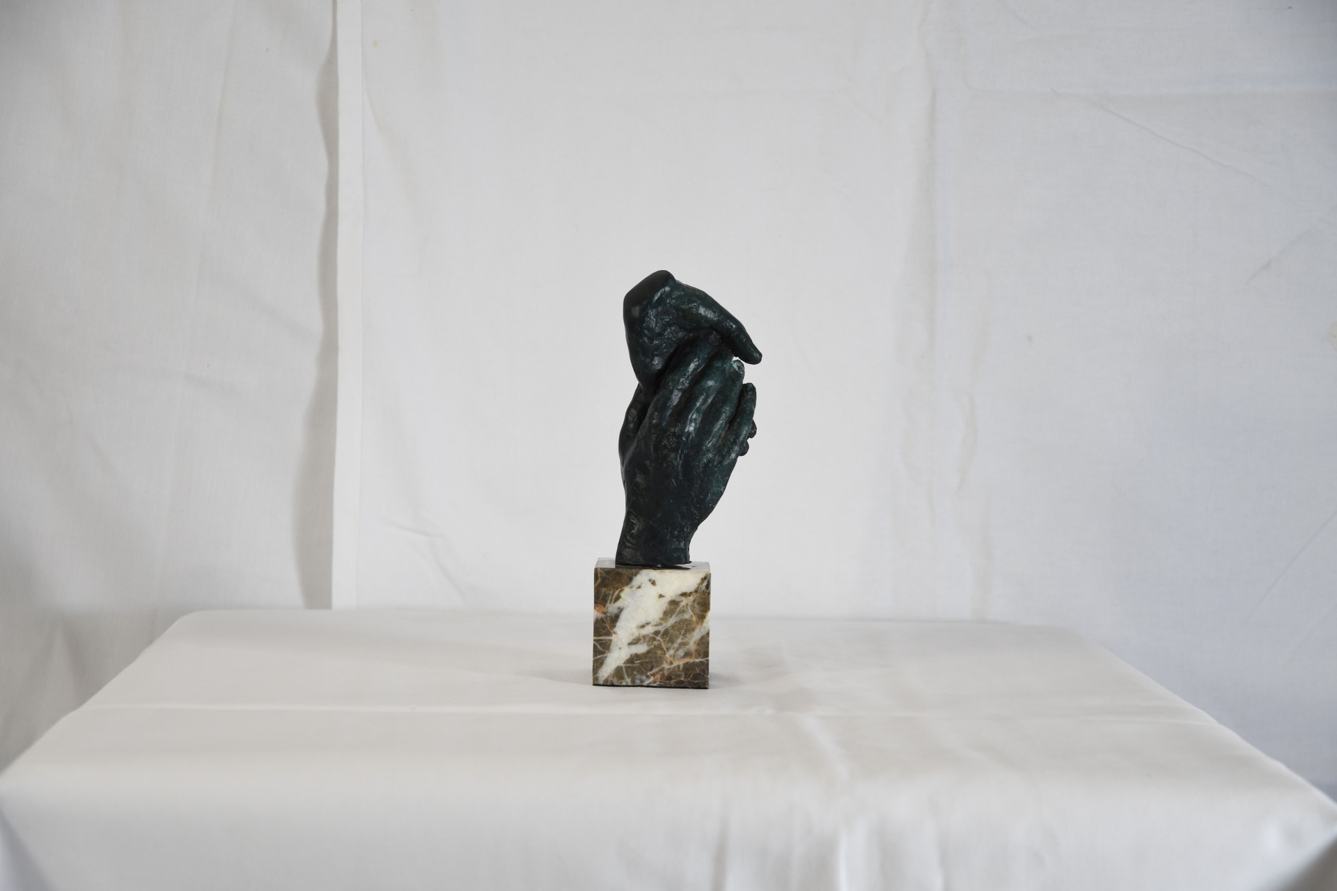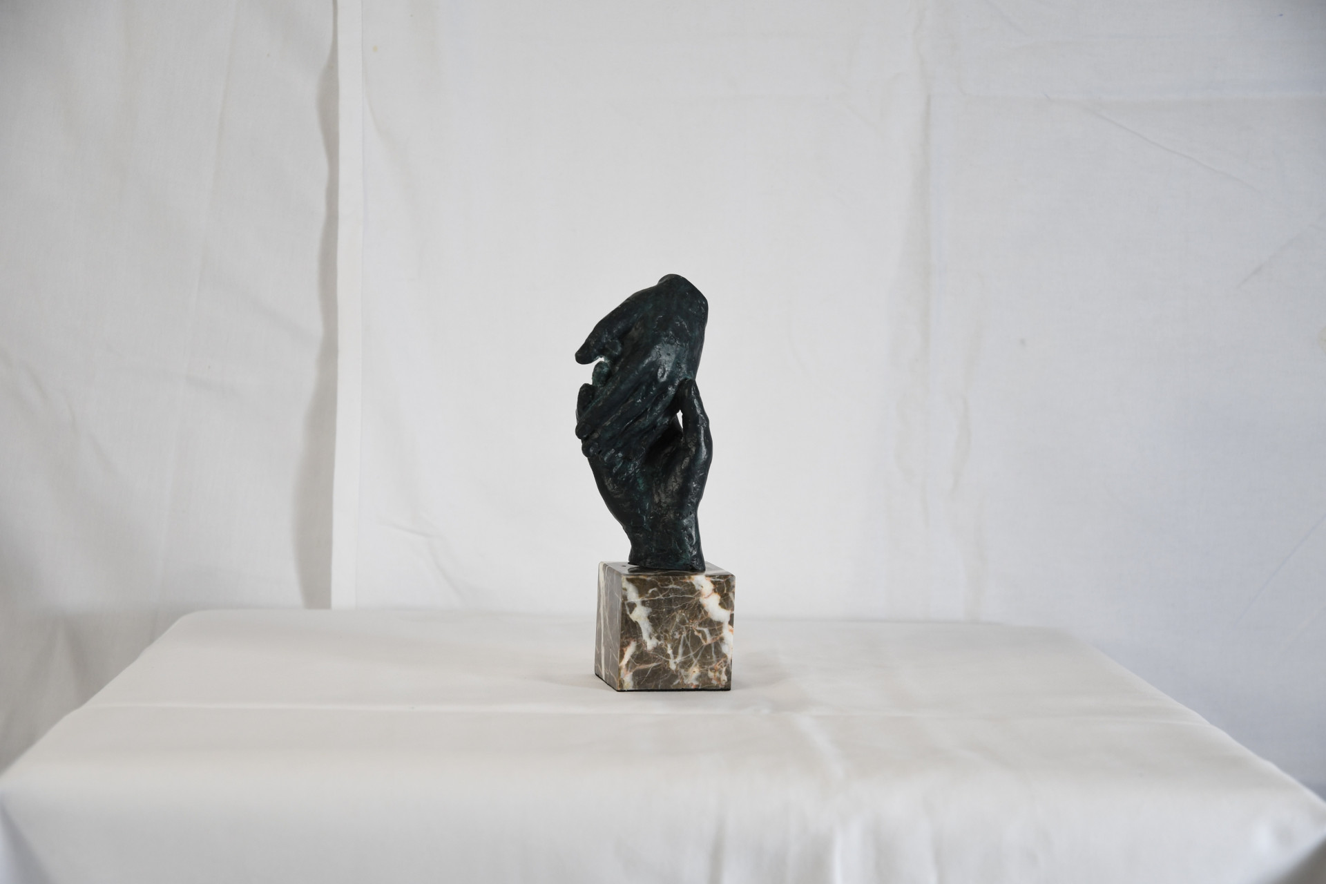 Bronze casting of friendship handshake on marble plinth. Finished with green patina.
