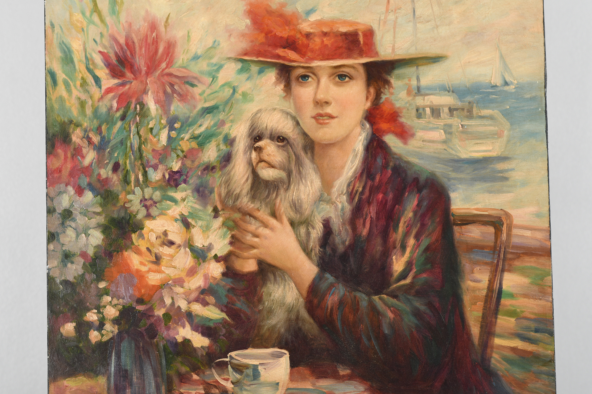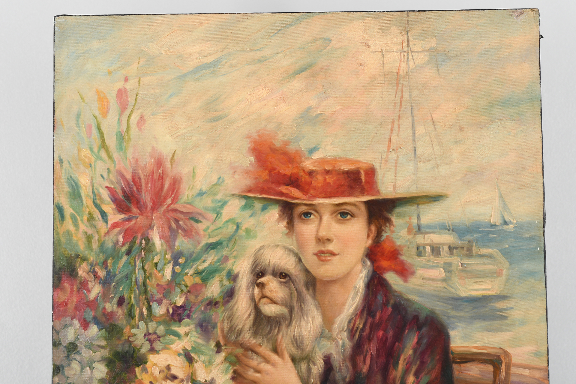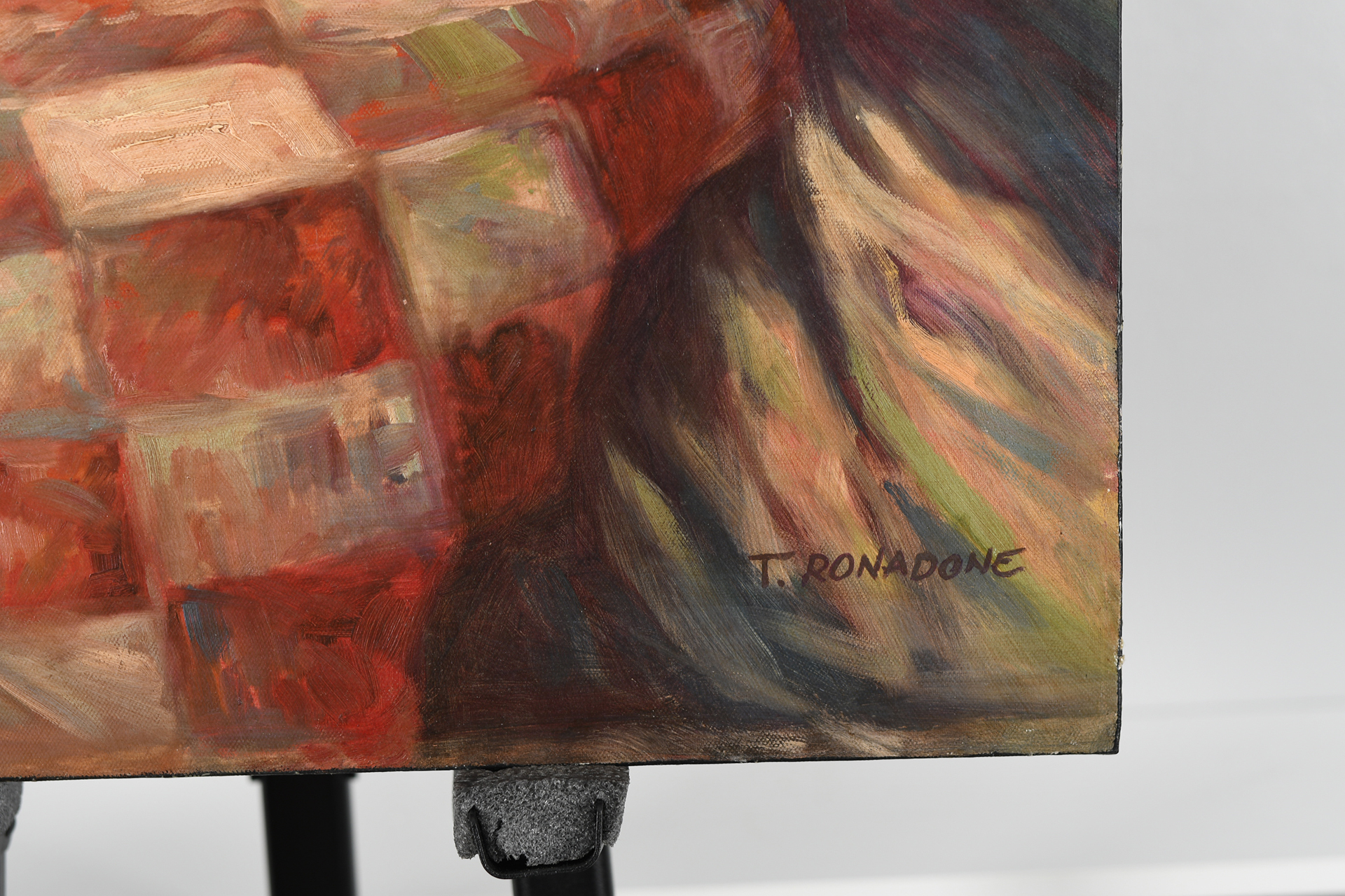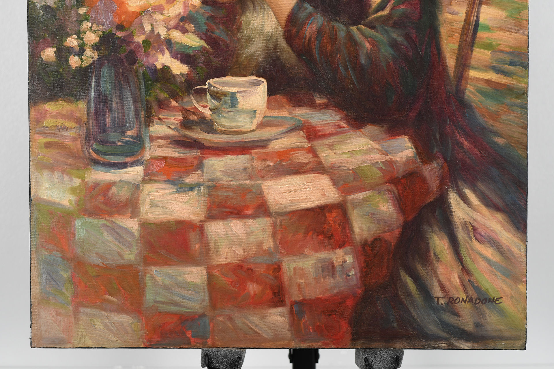 Original painting on canvas signed T. Ronadone. Depicting a Lady with her dog. Ready to frame.